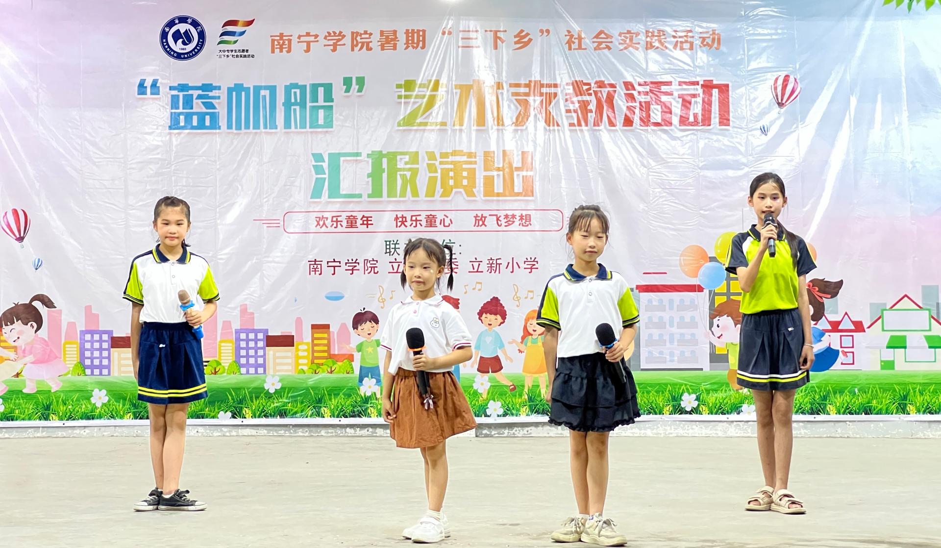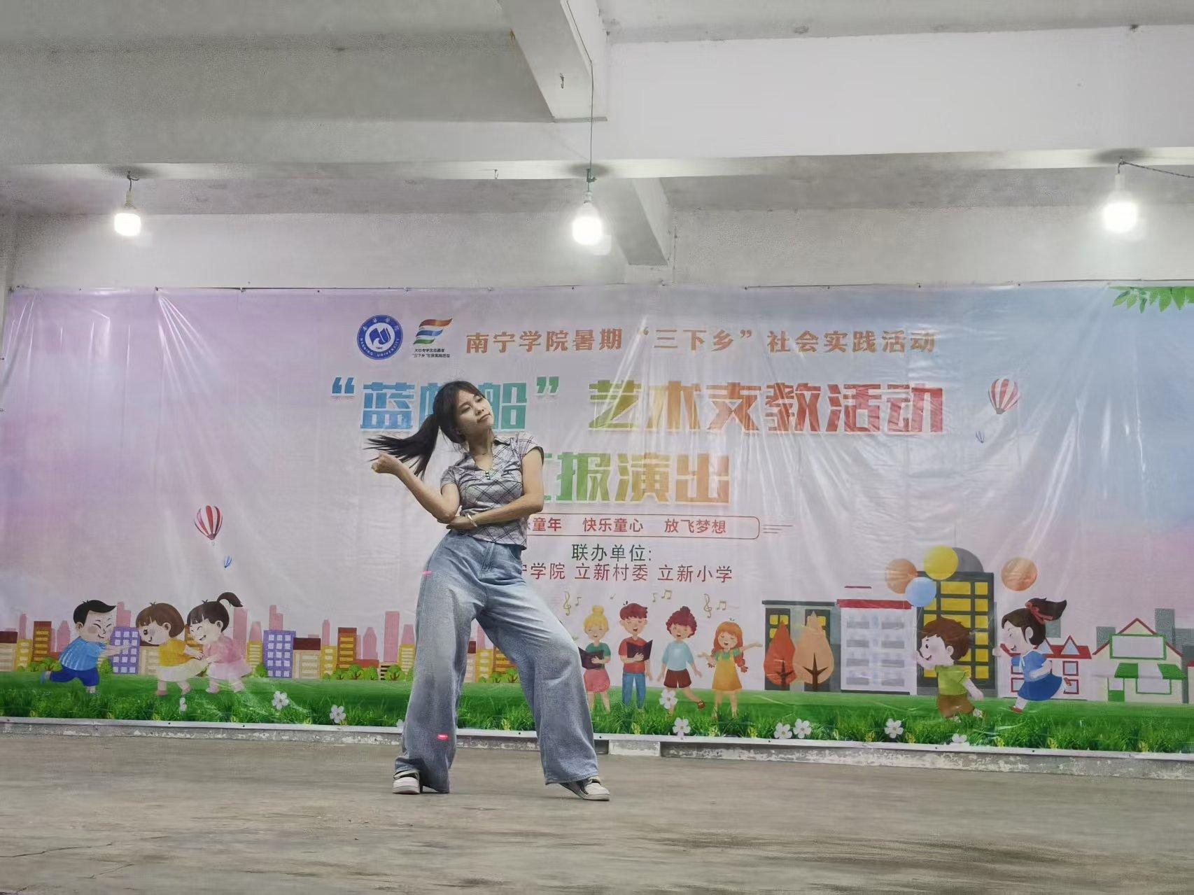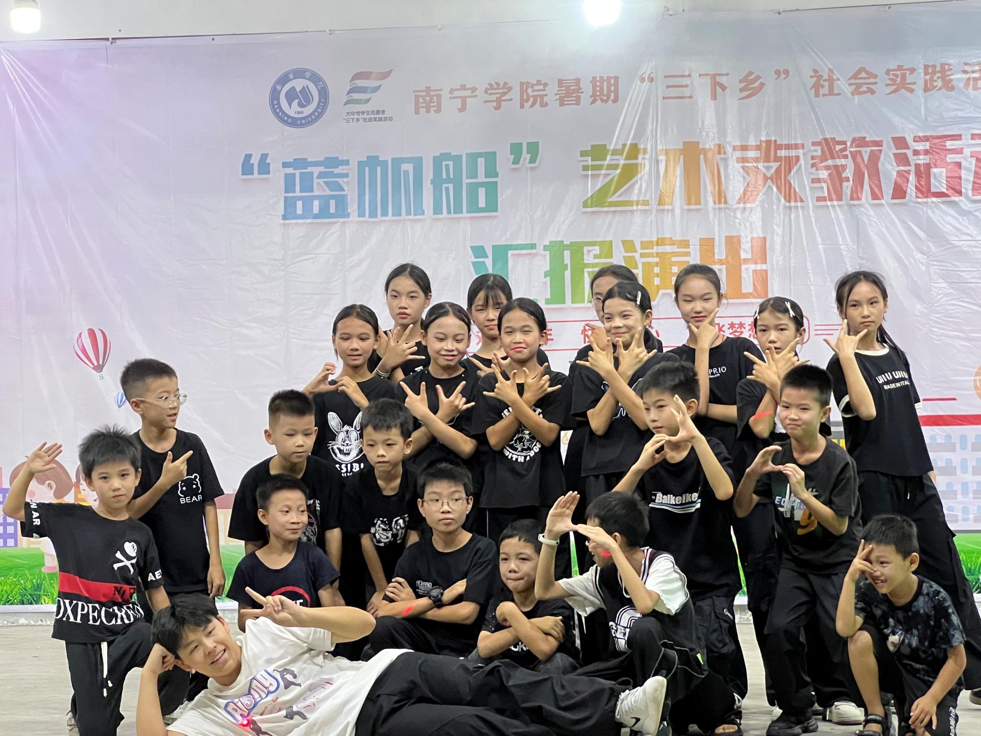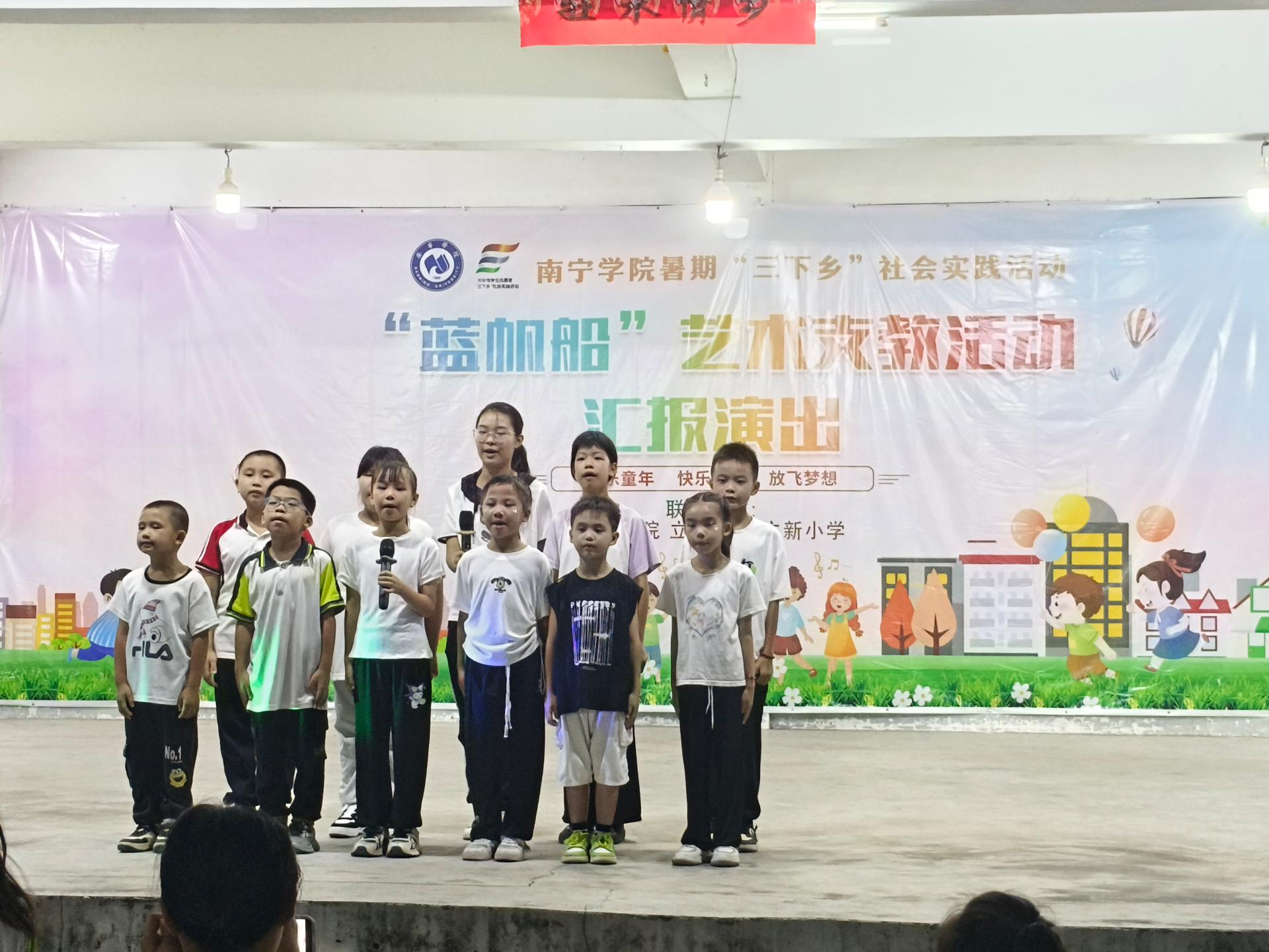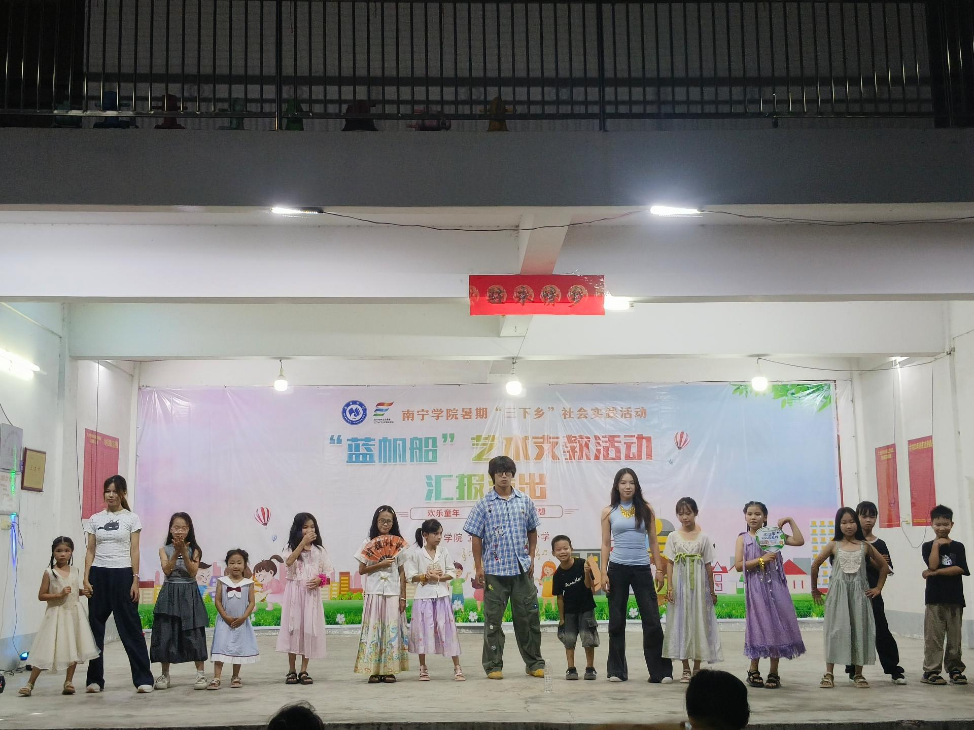 7月10日,南宁学院“蓝帆船”美育宣讲实践团在宾阳县立新学校开展的为期一周的美育宣讲实践活动迎来高光时刻。一场精彩纷呈的汇报演出在热烈的氛围中圆满落幕,为此次意义非凡的“三下乡”社会实践活动画上了完美的句点。