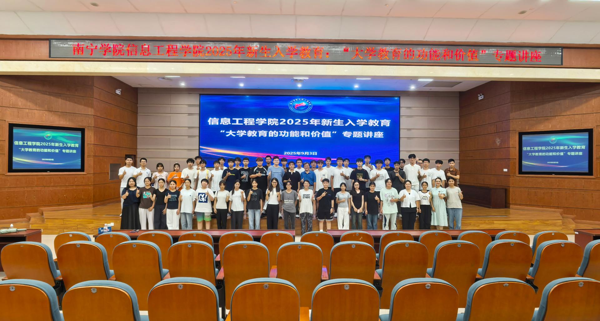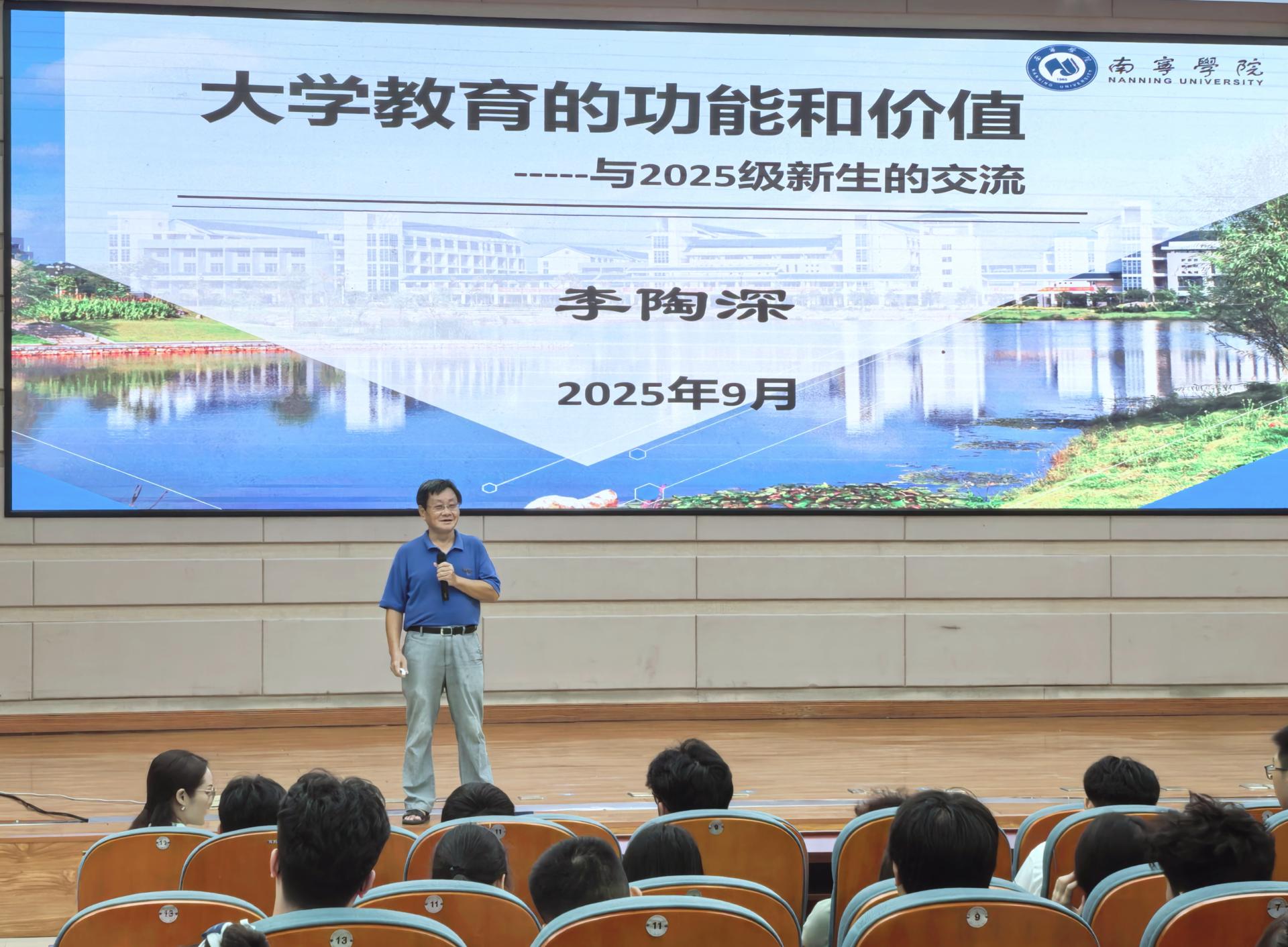 9月3日晚,南宁学院信息工程学院在图书馆报告厅成功举办新生入学教育专题讲座。学校副校长李陶深教授应邀出席,并作题为《大学教育的功能和价值——与2025级新生的交流》的主题报告,为刚刚踏入大学校园的2025级新生带来了一场启迪思考、凝聚共识的专题讲座。信息工程学院党委副书记廖秀媛主持会议,学院2025级全体新生参加活动。