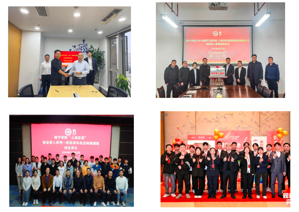 双教融合,定向培养。在国家“双碳”目标引领下,学院敏锐把握新能源风电行业发展机遇,五级联动全员参与,深入开展“访企拓岗促就业”专项行动,近3年访问企业100余家。精准对接上海电气研砼(木垒)建筑科技有限公司、上海华砼绿筑新能源有限公司等风电行业龙头企业,创新打造“风电混塔定向就业培训班”项目,校企协同构建双主体“选拔-培养-就业”全周期订单式人才培养体系。自项目实施以来,“风电混塔定向就业培训班”已开设5期,分7批次输送235人至企业一线实习,促成107名应届毕业生顺利就业,成为学院就业增长的新引擎。同时,深度推进产教与科教双融合,在新能源风电混塔技术领域,2024年校企联合申报并获批广西重点研发计划项目1项,成立校级工程研究中心1个,立项横向科研课题1项,申报广西工程研究中心1个,申请实用新型专利1项,建设校外实践教学基地5个。