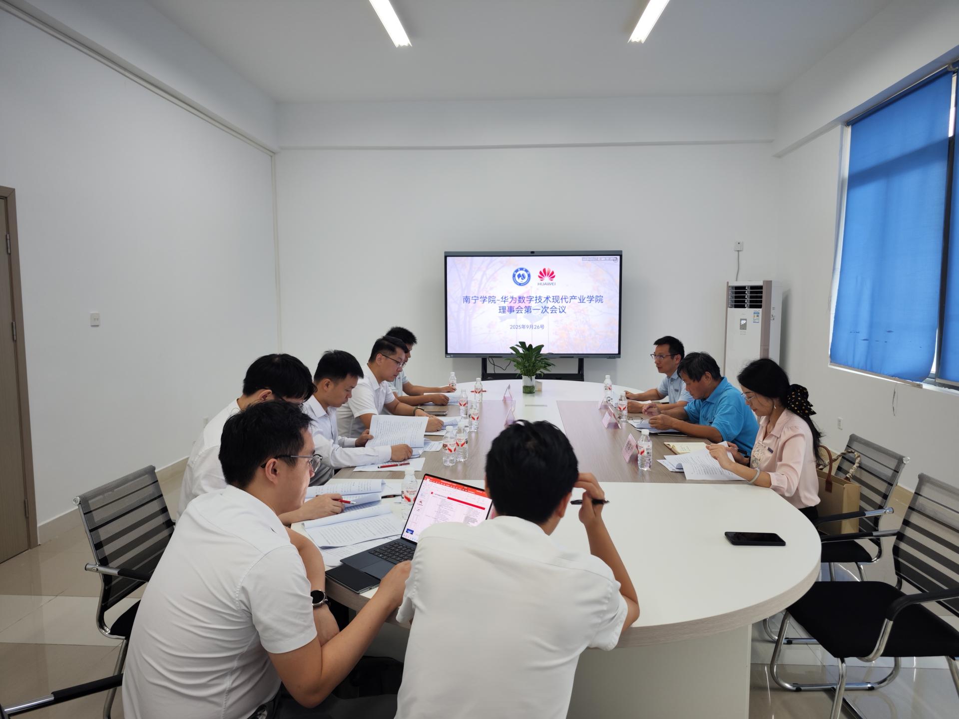 成立大会结束后,理事会第一次会议在华为楼209会议室召开,全体理事会成员参会。会议完成两项核心议程:一是审议通过《2024—2025学年产业学院建设评估报告》,产业学院院长刘泉生汇报2024-2025学年建设成果;二是审议通过《2025—2026学年产业学院工作计划》,华为企培与认证部院校交付部项目经理余文华介绍新学年重点任务。此外,校企双方还围绕产业学院发展展开深入交流,进一步凝聚合作共识。