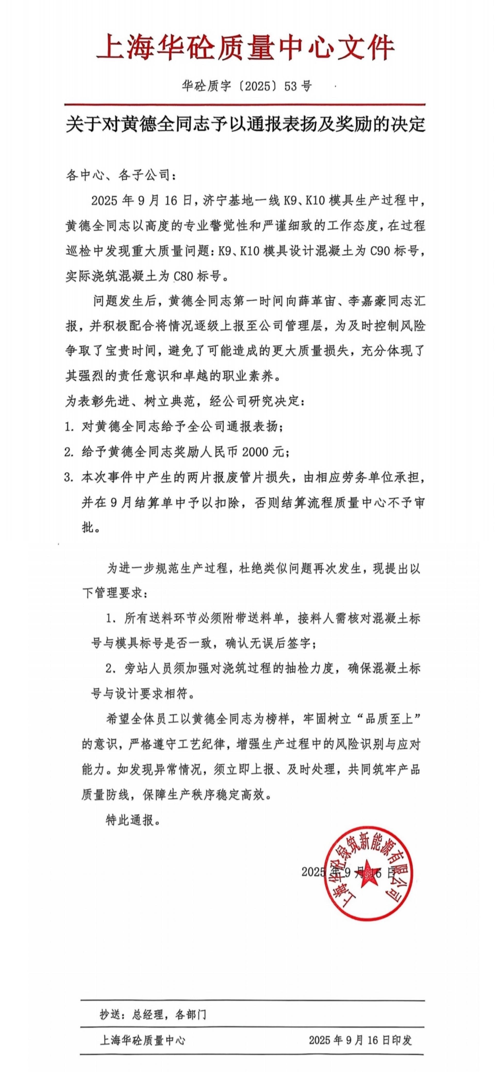 近日,土木与建筑工程学院收到上海华砼绿筑新能源有限公司通报表扬决定文件,2025届“风电混塔定向就业培训班”第一期优秀学员黄德全以高度的专业警觉性和严谨细致的工作态度,在过程巡检中发现重大质量问题,及时控制风险,避免了可能造成的更大质量损失,获得公司通报表扬并奖励。