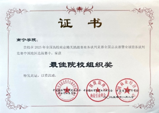 2025年11月2日,全国高校商业精英挑战赛商务谈判全国总决赛暨全球商务谈判竞赛中国地区选拔赛落下帷幕。我校学子在全国54所本科院校160支队伍的激烈角逐中脱颖而出,最终斩获本科组一等奖1项、二等奖2项、三等奖7项的优异成绩,同时,凭借出色的赛事组织与全方位的备赛保障,南宁学院荣获“最佳院校组织奖”。