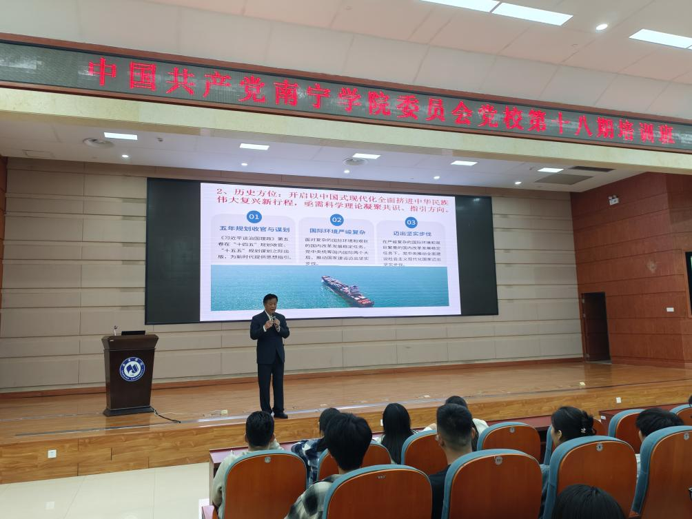 10月31日,中国共产党南宁学院委员会党校第十八期(总第52期)培训班开班典礼在图书馆报告厅隆重举行。开班典礼结束后,唐国军教授以《〈习近平谈治国理政〉(第五卷)学习导读》开启第一课,他立足新时代治国理政的生动实践,围绕“两个结合”的根本途径、“六个必须坚持”的世界观方法论以及中国式现代化的主题主线等核心要义,进行了层层深入的解读阐释。整场授课脉络清晰、案例鲜活,既有理论高度又有实践温度,引发了学员们的强烈共鸣。