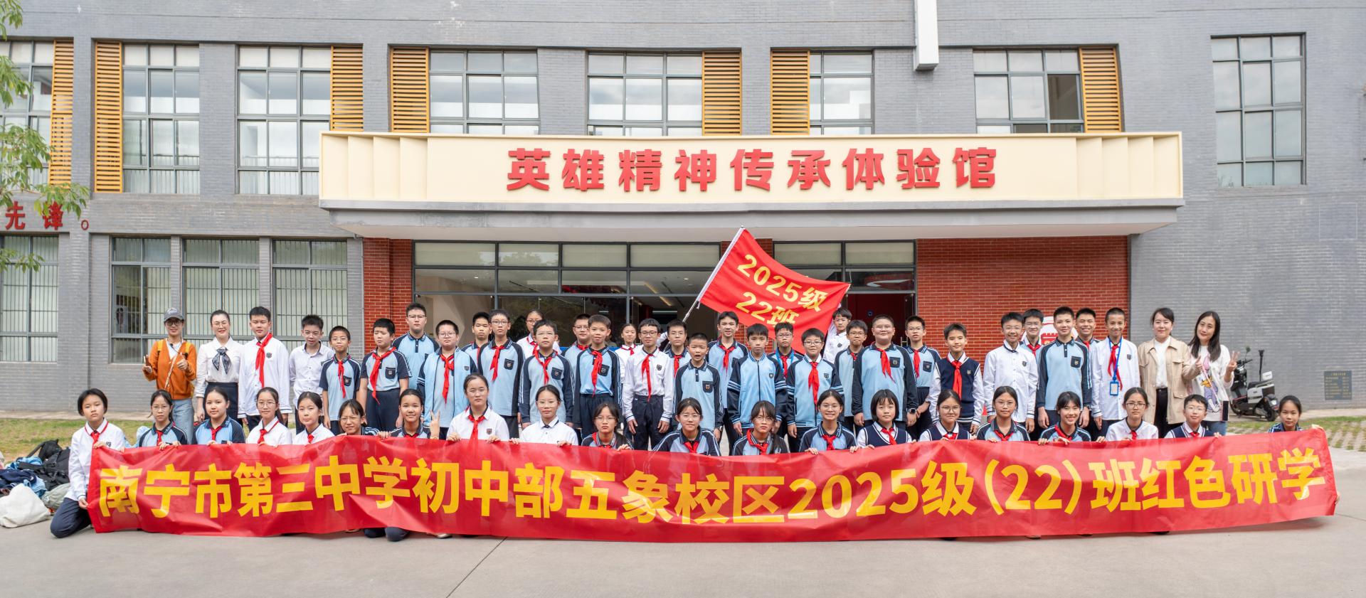 南宁市第三中学初中部学生代表于南宁学院英雄精神传承体验馆前合影