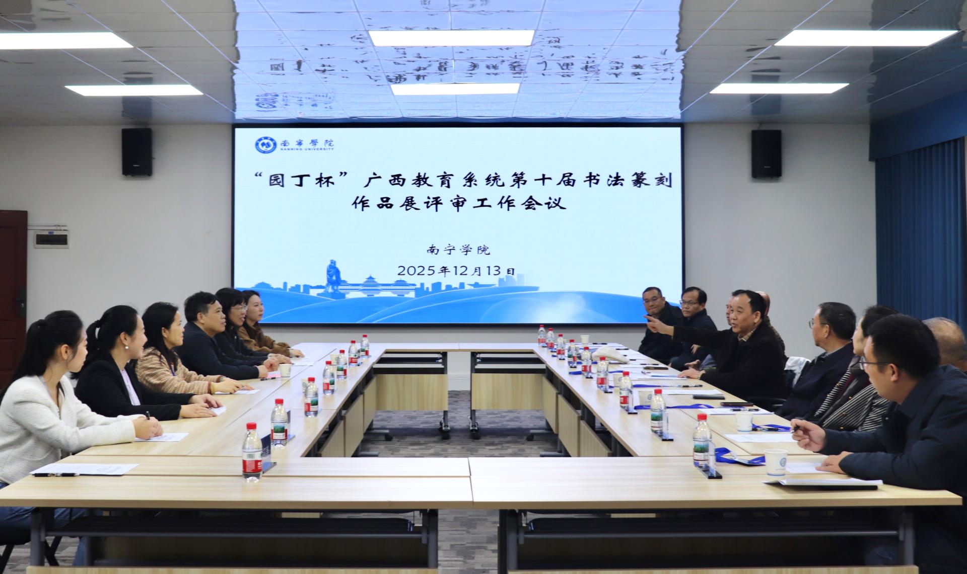 2025年12月13日至14日,“园丁杯”广西教育系统第十届书法篆刻作品展评审工作在南宁学院顺利开展。本次活动由南宁学院承办,旨在评选出代表广西教育系统书法篆刻艺术水准的优秀作品,进一步弘扬中华优秀传统文化,推动学校美育浸润行动落地落实。