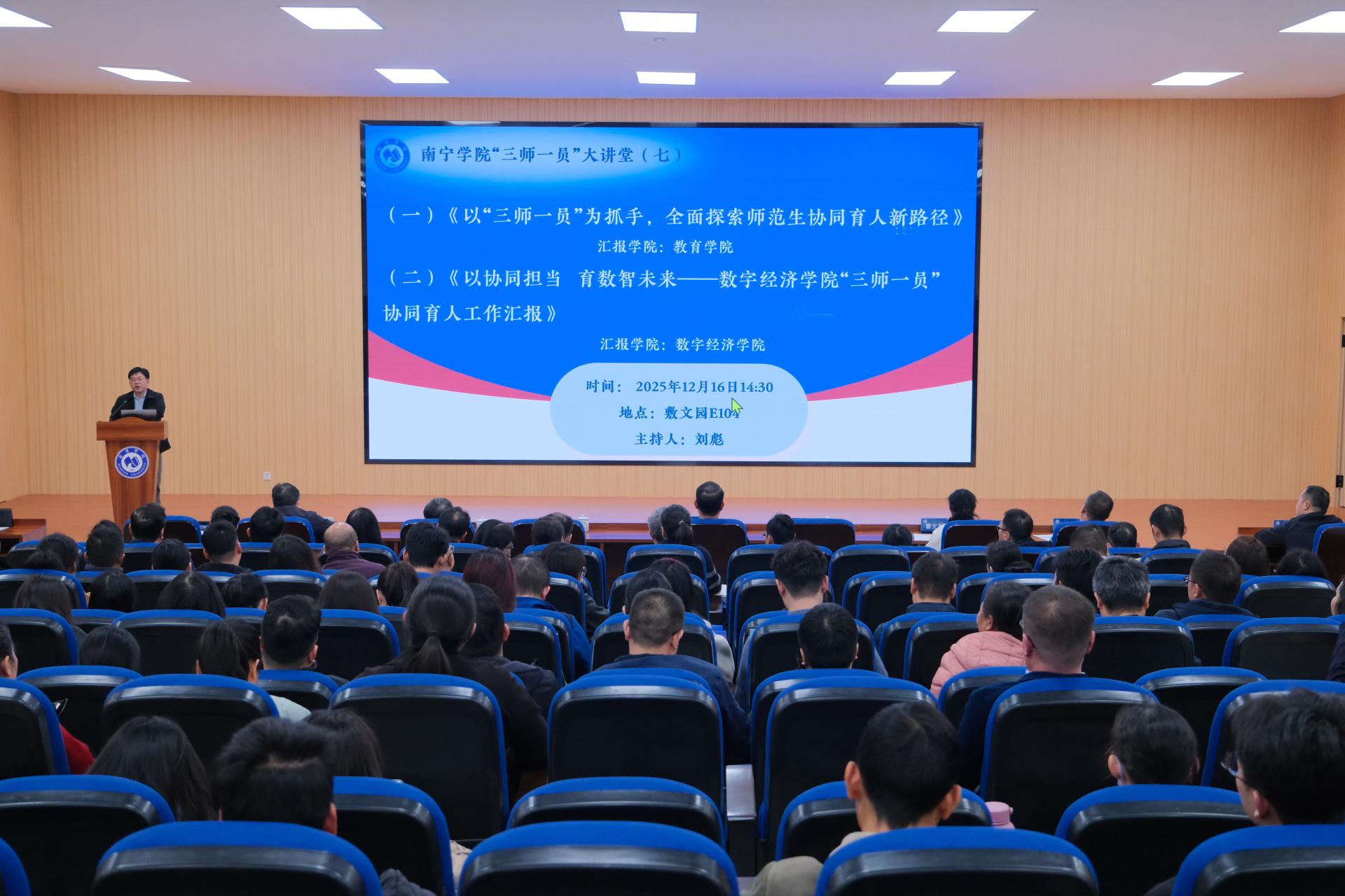 为深入贯彻落实立德树人根本任务,南宁学院以“三师一员”协同育人机制为关键抓手,通过全年举办七期专题大讲堂,系统推进“三全育人”综合改革走向深入。12月16日,随着第七讲在敷文园E104报告厅圆满举行,本年度大讲堂系列活动正式收官。本期活动由教育学院、数字经济学院展示基层创新实践,学校党委书记刘彪作总结讲话。系列活动的成功举办,不仅标志着学校协同育人工作实现了 “有形覆盖” 的阶段性目标,也更清晰地指明了向“有效提质” 深刻转型的战略方向。