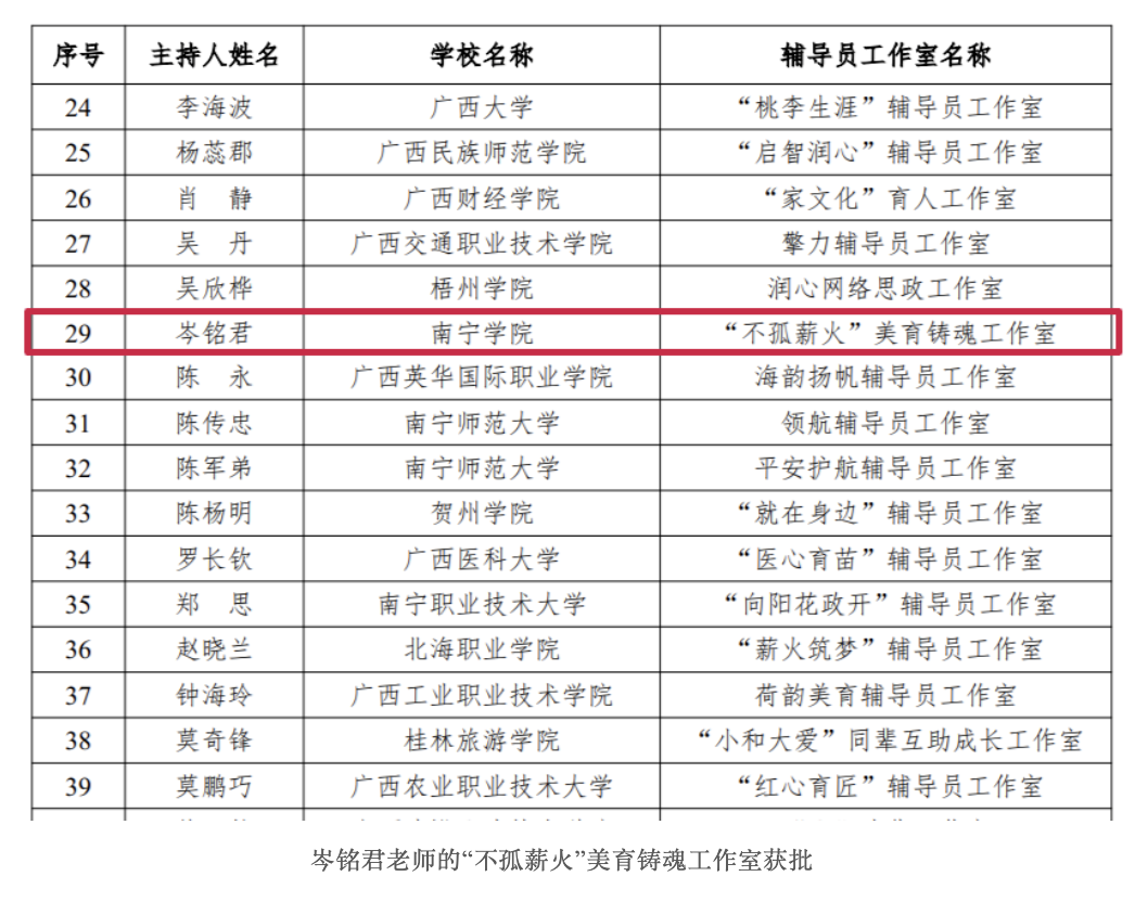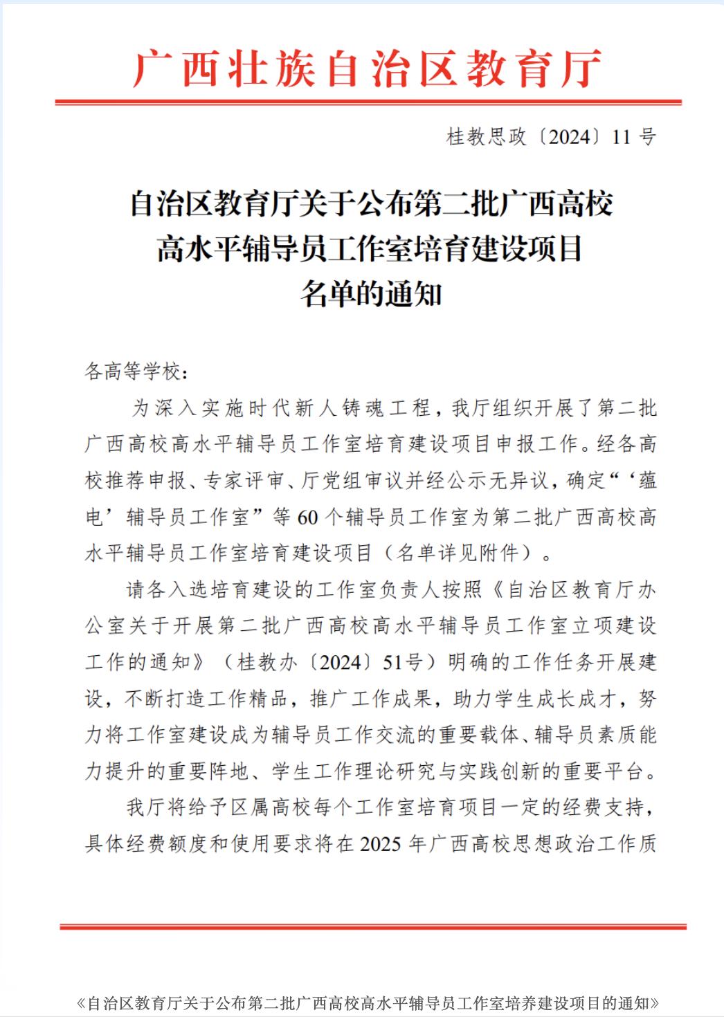 近日,《自治区教育厅关于公布第二批广西高校高水平辅导员工作室培养建设项目的通知》(桂教思政〔2024〕号11)公布,我校“职”达未来工作室、“不孤薪火”美育铸魂工作室经团队申报、学校选拔推荐、专家评审、线上答辩等环节,顺利获批为第二批广西高校高水平辅导员工作室培育建设项目。