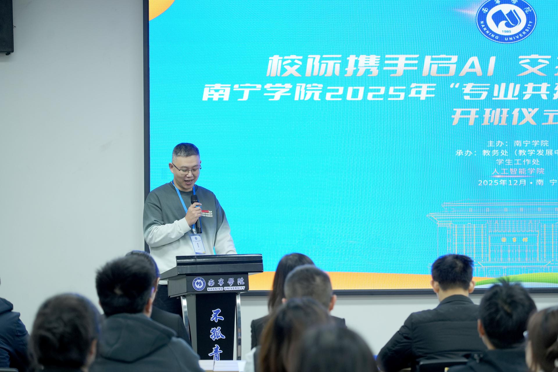 开班仪式由人工智能学院副院长薛广明(主持日常工作)主持。南宁学院副校长王宁章在致辞中指出,此次活动是两校依托“不孤”联盟搭建的校际合作平台,旨在打破校际资源壁垒,整合两校在人工智能领域的教学优势与实践资源,为学生提供跨校学习、协同创新的优质环境。他鼓励两校师生以此次活动为纽带,加强交流互动,共同探索产教融合背景下的人才培养新模式。