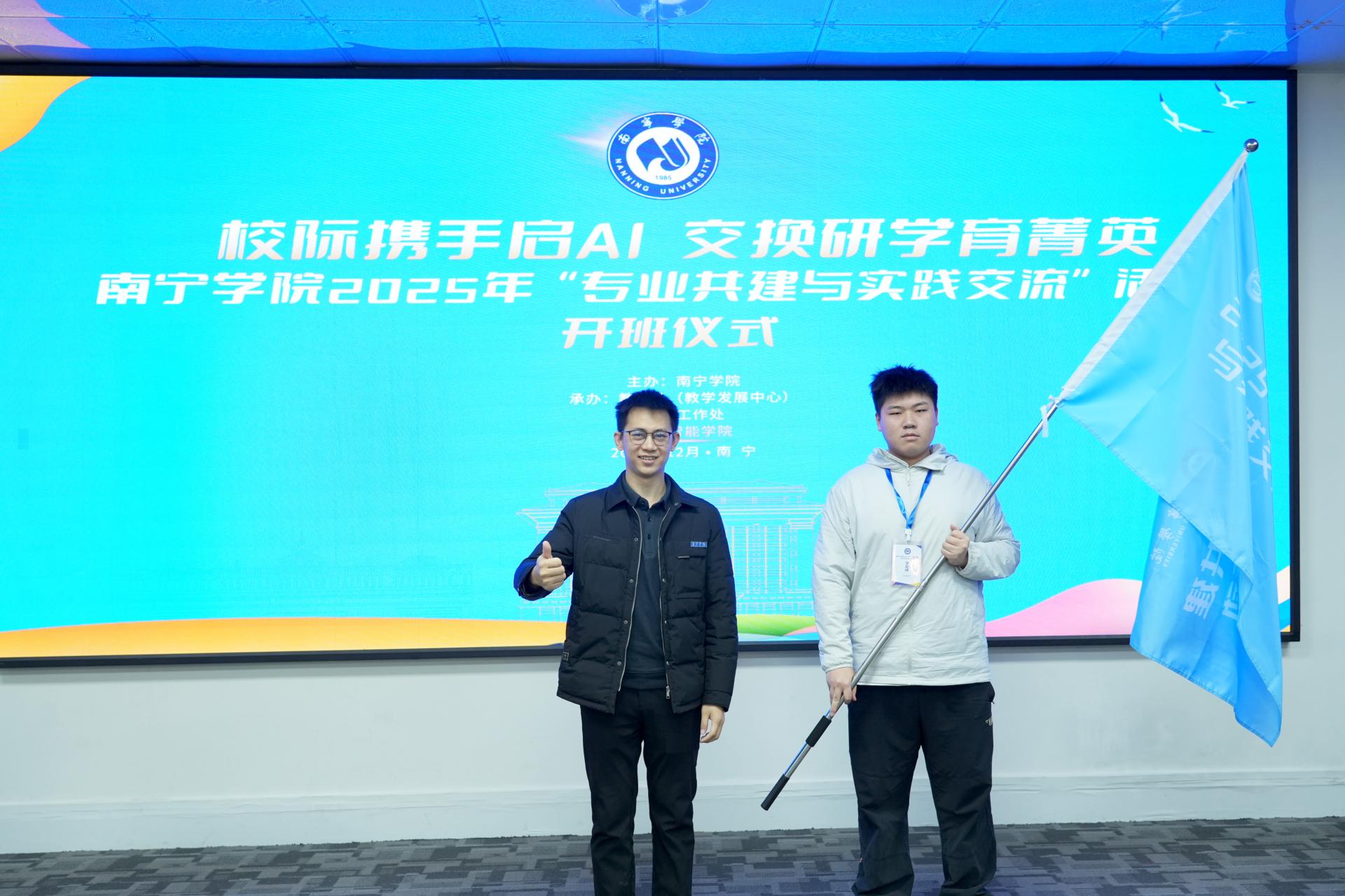 仪式上,教务处副处长杨汉宁向交换生授予班旗,交换生代表郑重接过班旗。随后交换生代表上台发言,分享了对融合课程的期望:“希望在南宁学院学习人工智能的特色课程,将专业知识转化为解决实际问题的能力。”同时表示,将珍惜此次交流机会,积极参与课程学习与实践项目,努力提升专业能力,为两校合作搭建友谊桥梁。