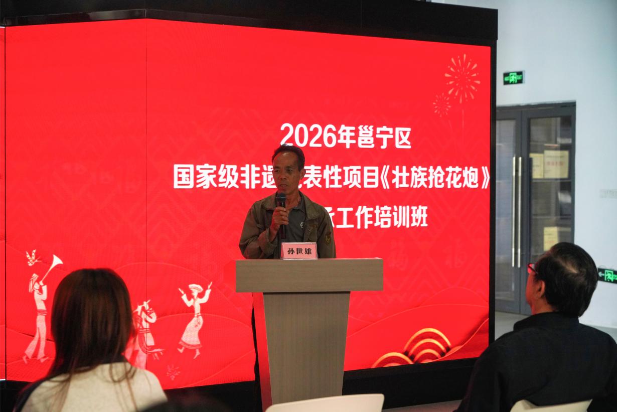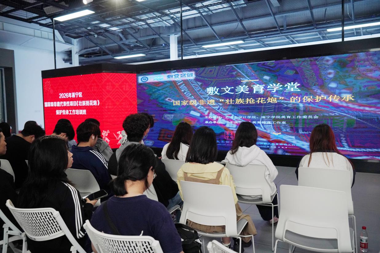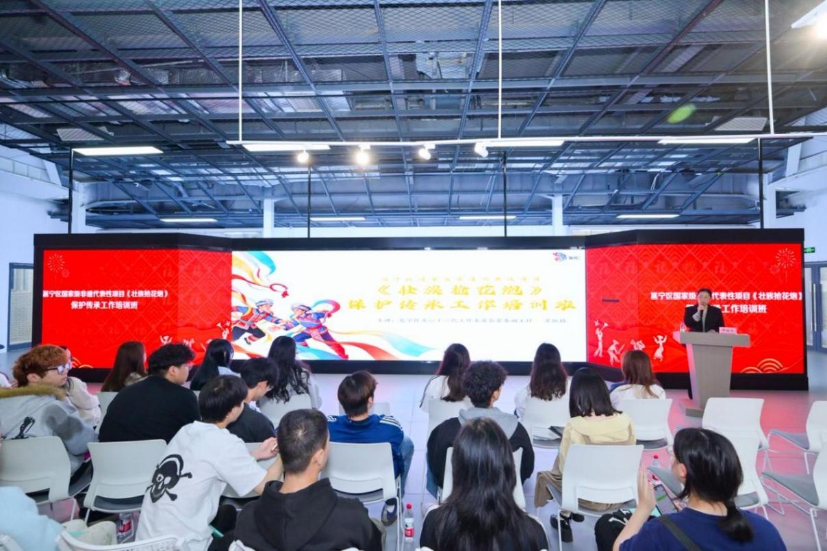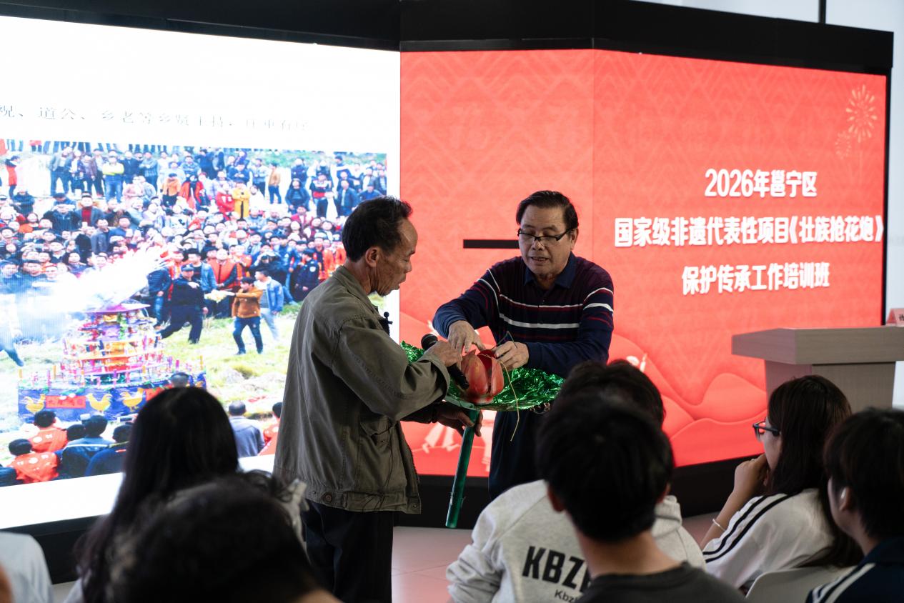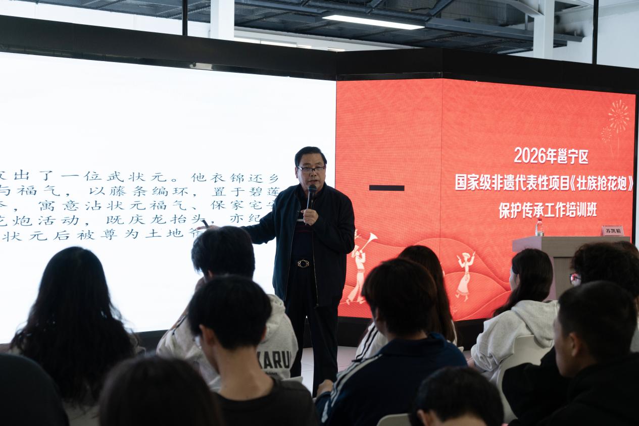 本次培训由谭冠玉老师主持。活动特邀壮族抢花炮民俗专家苏凯精老师,开展以《壮族抢花炮》为主题的专题讲座;市级非物质文化遗产代表性传承人孙世雄现场分享传统花炮制作技艺。2025级新媒体艺术5班全体学生参加学习。本次培训创新采用“专家授课 + 互动实践”模式,聚焦非遗本源传承与传播推广,让学生近距离感受非遗文脉,厚植传承情怀。