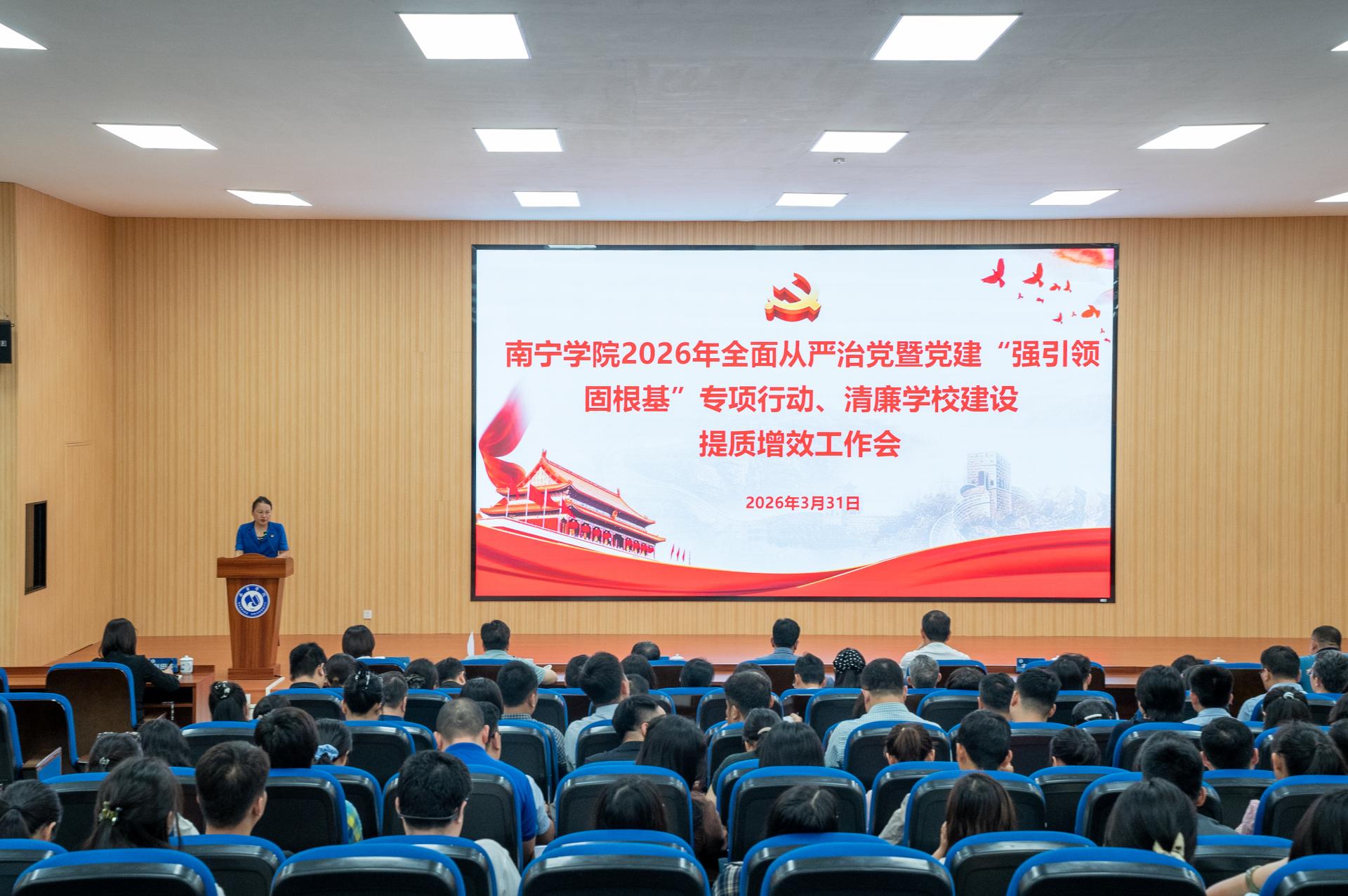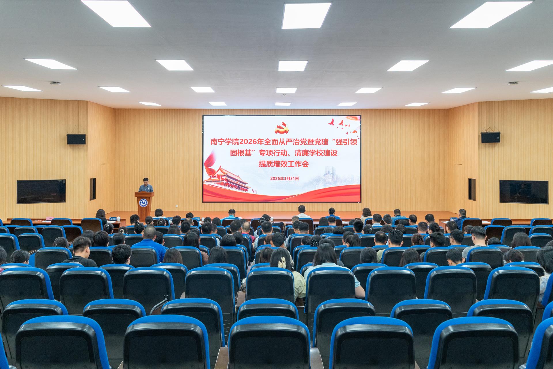 3月31日下午,南宁学院召开2026年全面从严治党暨党建“强引领 固根基”专项行动、清廉学校建设提质增效工作会,深入学习贯彻党的二十大和二十届历次全会精神,全面落实自治区十二届纪委六次全会、2026年全区教育系统全面从严治党暨清廉学校建设提质增效工作视频会议及全区学校党建“强引领 固根基”专项行动会议精神,总结学校全面从严治党和清廉学校建设工作成效,部署2026年重点任务,动员全校各级党组织和广大党员干部进一步统一思想、压实责任、狠抓落实,为学校高质量发展筑牢政治根基、提供纪律保障。全体校领导、二级单位党政负责人、二级学院党委(党总支)副书记及全体教工、学生党支部书记参加会议。会议由校党委副书记、副校长韦粤桂主持。