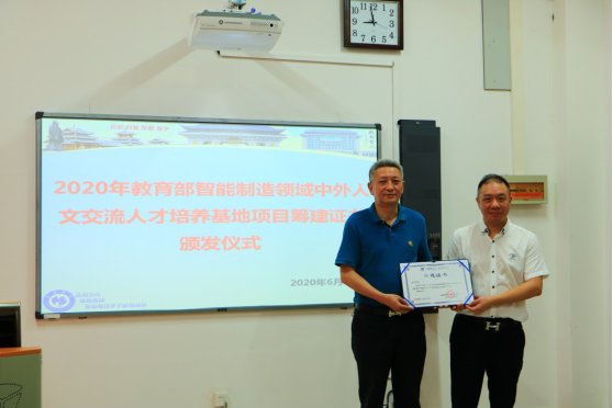 2020年6月18日,亚龙智能装备集团股份有限公司西南营运中心总经理兼广西省级市场总监李瑞道、广西区经理雷剑锋、总监助理覃美苇一行人代表教育部中外人文交流中心来到南宁学院举行《教育部2020年智能制造领域中外人文交流人才培养基地筹建证书》颁发仪式。南宁学院副校长兼中国-东盟综合交通国际联合实验室主任文旭光,南宁学院交通学院院长陈红保、副院长庞彦知,产学研处副处长张艳雯及交通学院轨道教研室教师参加了仪式。