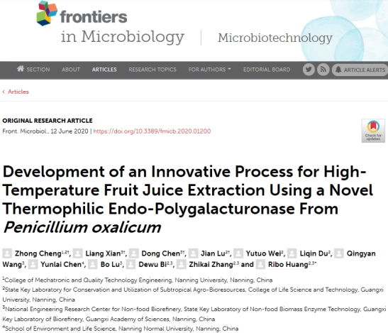 2020年6月,南宁学院食品教研室程忠博士以南宁学院为第一作者单位(作者署名第一)在微生物学领域知名期刊Frontiers in Microbiology》(目前最新影响因子为4.259,中科院生物大类二区)发表了题为“Development of an Innovative Process for High-Temperature Fruit Juice Extraction Using a Novel Thermophilic Endo-Polygalacturonase From Penicillium oxalicum”的研究论文。