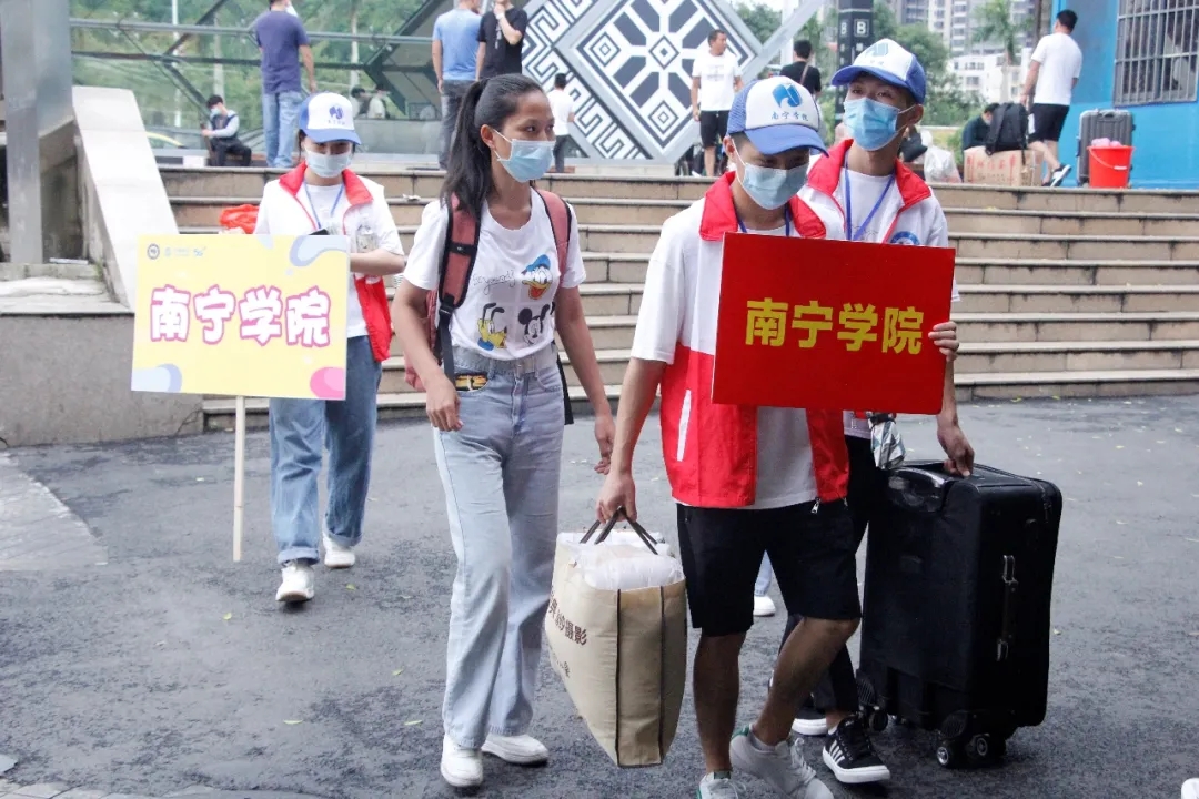 校园内,志愿者身着统一服装,分布在学校南大门、北门和各学院报到处,热情地为新生搬运行李,耐心地向新生提供引导、指示和答疑,迎接可爱的学弟学妹们。迎新期间,学校分别在南宁火车东站、琅东汽车客运站、南宁火车站设置接站点。在各接站点,志愿者们分工明确,有的举着引导牌,有的负责签到,有的帮忙搬运行李,各项接待服务工作有序开展。无论是在校内还是在各接站点,志愿者们在接待新生的过程中热情细致、服务周到,充分展现出一名“不孤”志愿者应有的“奉献、友爱、互助、进步”“不孤志愿服务”精神。