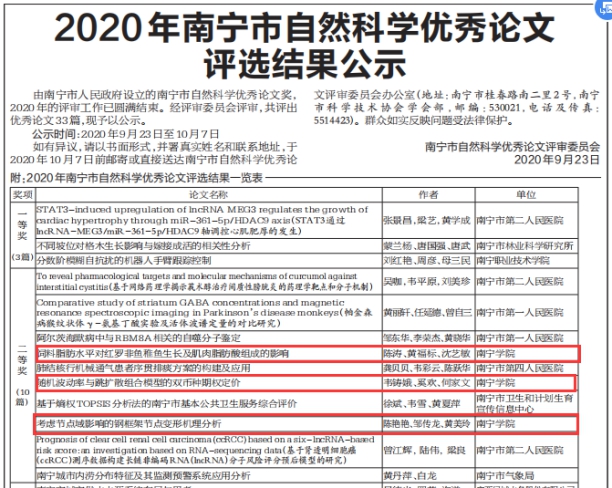 近日,由南宁市人民政府设立的南宁市自然科学优秀论文奖,2020年的评审工作已圆满结束,并在南宁日报对评选结果进行了公示。经评审委员会评审,共评出优秀论文33篇。其中,我校陈涛、韦铸娥、陈艳艳等老师的论文荣获2020年南宁市自然科学优秀论文二等奖