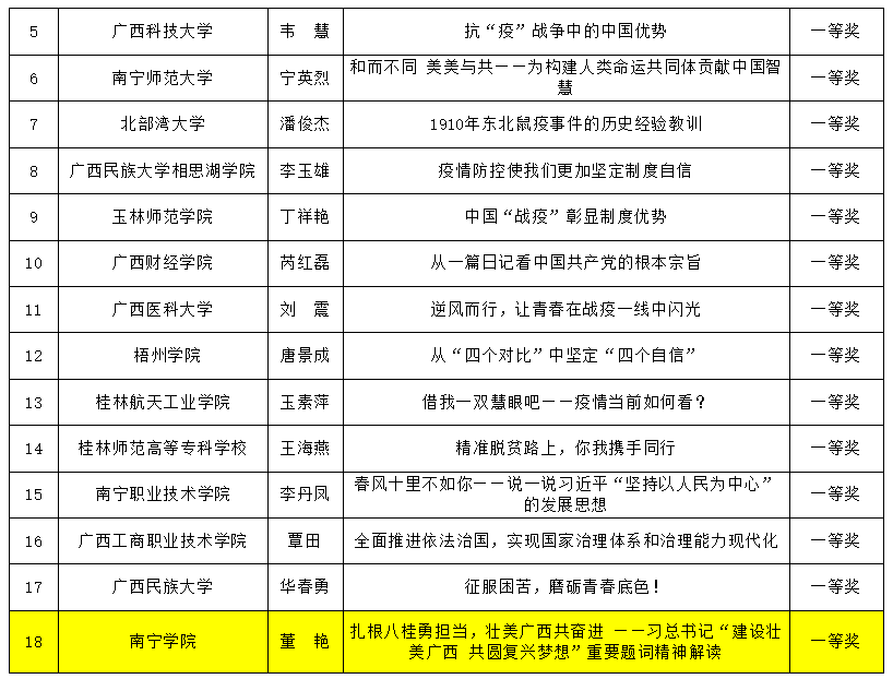 其中,董艳老师主题为《扎根八桂勇担当,壮美广西共奋进——习总书记“建设壮美广西 共圆复兴梦想”重要题词精神解读》的宣讲视频荣获比赛一等奖,张连云老师主题为《千磨万击还坚劲,初心使命得民心——有效防控疫情彰显“四个全面”战略布局伟大力量》;黄海莲老师主题为《建设美丽中国,共享生态福祉——习近平生态文明思想的人民情怀》的宣讲视频同获比赛优秀奖。