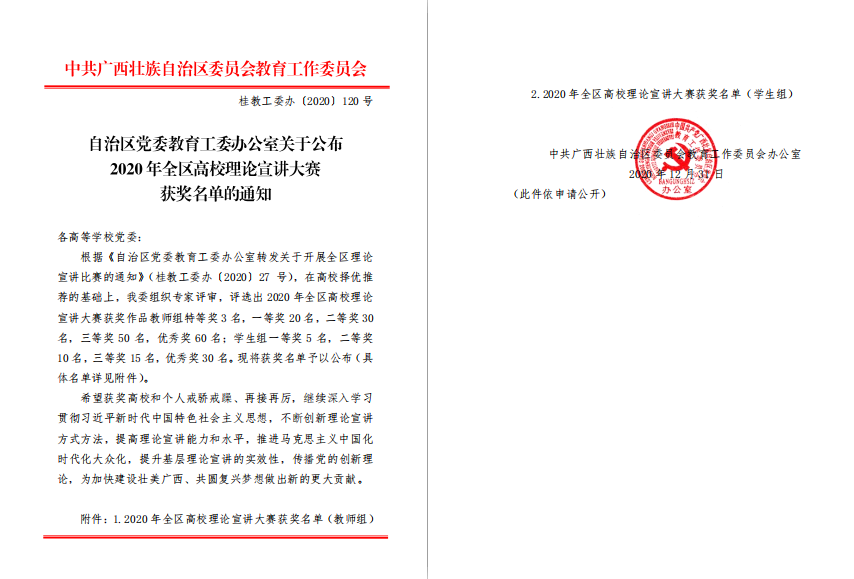 近日,自治区党委教育工委公布2020年全区高校理论宣讲大赛获奖名单,经自治区高等教育工委组织专家评审,评选出2020年全区高校理论宣讲大赛获奖作品教师组特等奖3名,一等奖20名,二等奖30名,三等奖50名,优秀奖60名。南宁学院马克思主义学院组织教师积极参赛,荣获一等奖1名、优秀奖2名的佳绩。