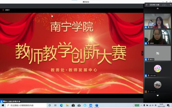 1月20日,南宁学院通过腾讯会议的方式开展了教学创新汇报线上评审会,至此,首届南宁学院教师教学创新大赛圆满落下帷幕。