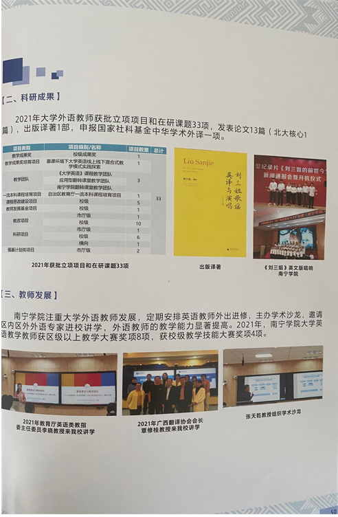 近日,南宁学院大学英语教学改革成果入选《2021年广西本科高校英语教学风采录》。该《风采录》由广西本科高校英语类教学指导委员会组织选编,是对全区高校英语类专业建设和大学英语改革优秀成果的总结与展示,供全区高校英语教学相互学习,共同提高。本次风采录的主题为人才培养模式创新,聚焦线上教学、课程思政、一流课程建设等方面的内容。