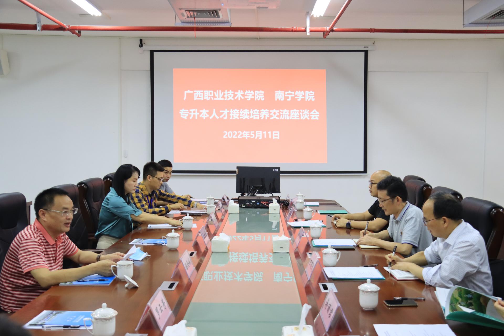 为进一步深化与高职院校的专升本交流合作,修订完善专升本人才培养方案,提升人才培养质量,5月11日下午,南宁学院商学院院长汪涛、副院长蒋丽君和数字经济学院副院长曹会兵、副院长王瑞龙带队,一行8人赴广西职业技术学院交流专升本人才接续培养工作,受到了广西职业技术学院商学院潘登斌院长、教务处何飞燕副处长等人的热情接待。