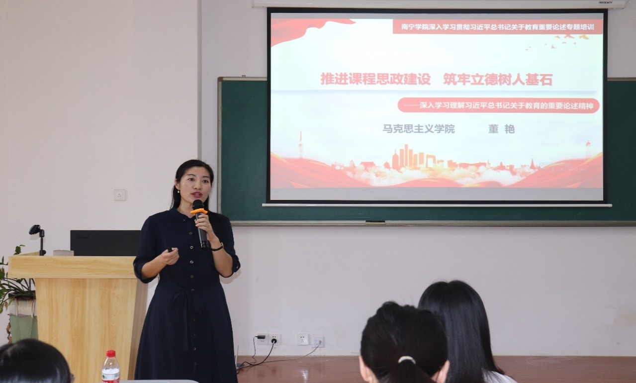 培训由董艳副院长主讲,她围绕马克思主义学院开发与建设的“习近平总书记关于教育的重要论述”(下称论述)校本培训课程,把论述作为核心培训内容,结合习近平总书记关于师德师风与“课程思政”建设的重要论述作为培训的主要内容。她深入地解读了习近平总书记关于教育的重要论述,强调了立德树人的重要意义。她提炼了论述的几个要点:一是论述的战略视野:责任重大,使命光荣;二是论述的内容体系:高屋建瓴,内涵丰富;三是论述的重大意义:深刻体会,学深悟透;四是论述的落地实施:化为行动,融合创新。培训会过程中,董副院长就通识课程的课程思政内容选择和融入,思政目标与通识课程融合的标准,以及课程思政融合误区等方面详细地讲解,内容有高度和深度,老师们听后受益匪浅。培训会第二个环节是现场互动,老师们研讨的热情高涨,纷纷就日常教学中遇到的课程思政与通识课程融合的困惑向宣讲团队请教,董副院长和黄伟先教授详尽地给老师们作了专业的指导。