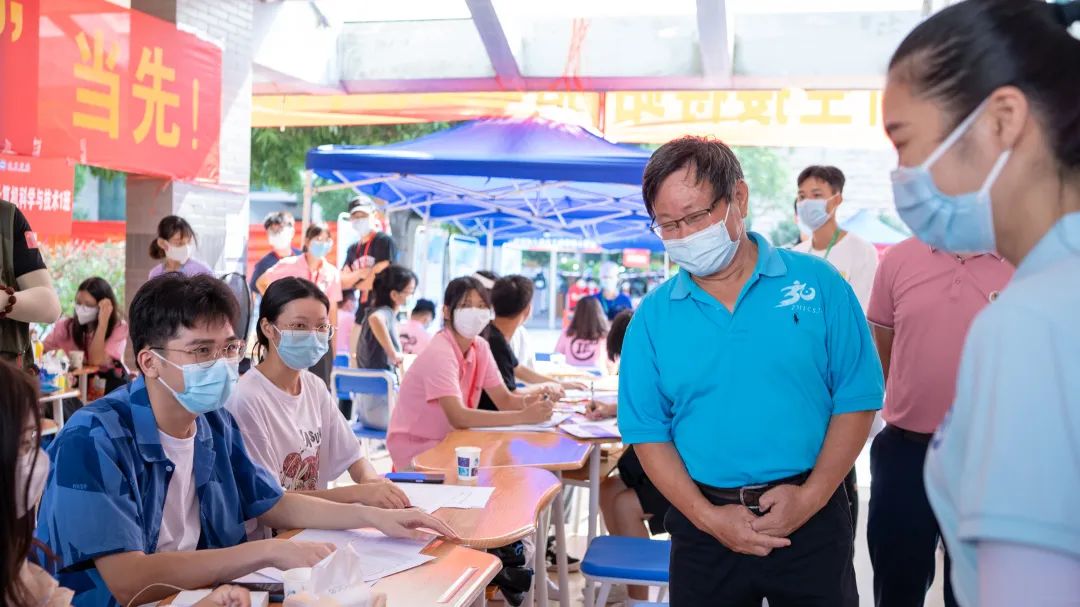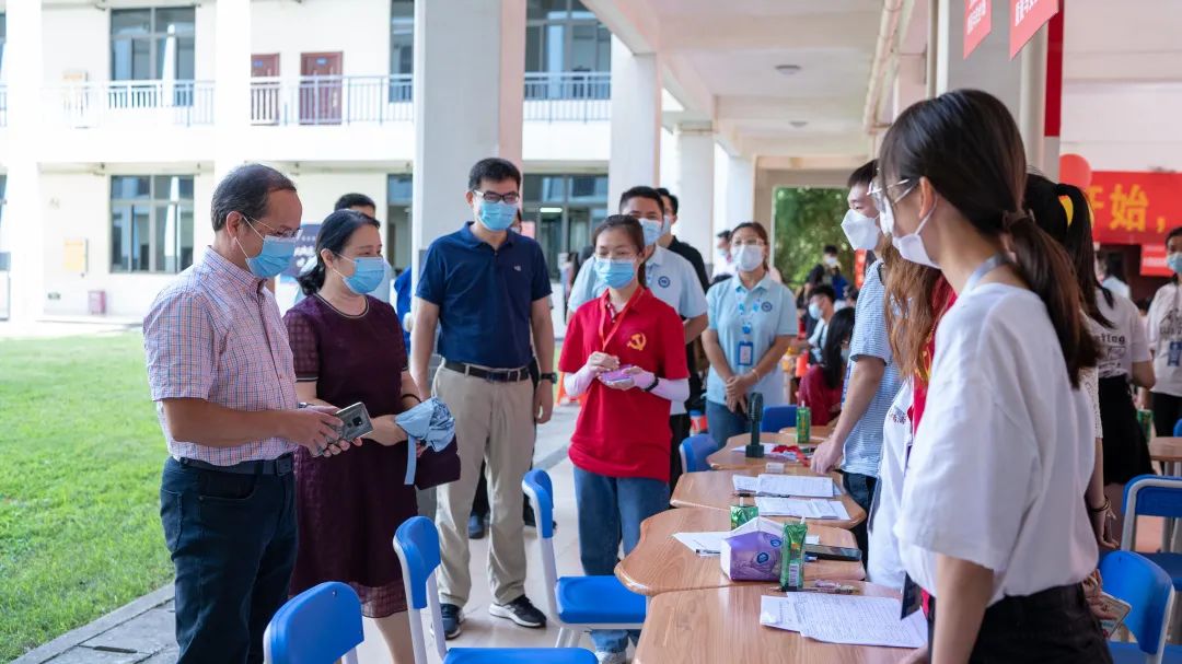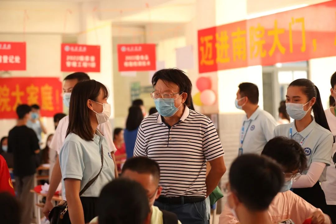 迎新期间,校长李栋学,党委书记刘彪,党委副书记覃存民,副校长陈雄章、李陶深、龚击及相关部门领导、老师前往新生报到点,满心欢喜地迎接新生到校,关切地询问新生报到情况、家庭情况等,勉励新生珍惜大学生活,在大学放飞自己的梦想;看望慰问工作人员、志愿者,详细询问、了解新生疫情防控、报到注册、宿舍安排等方面的情况。