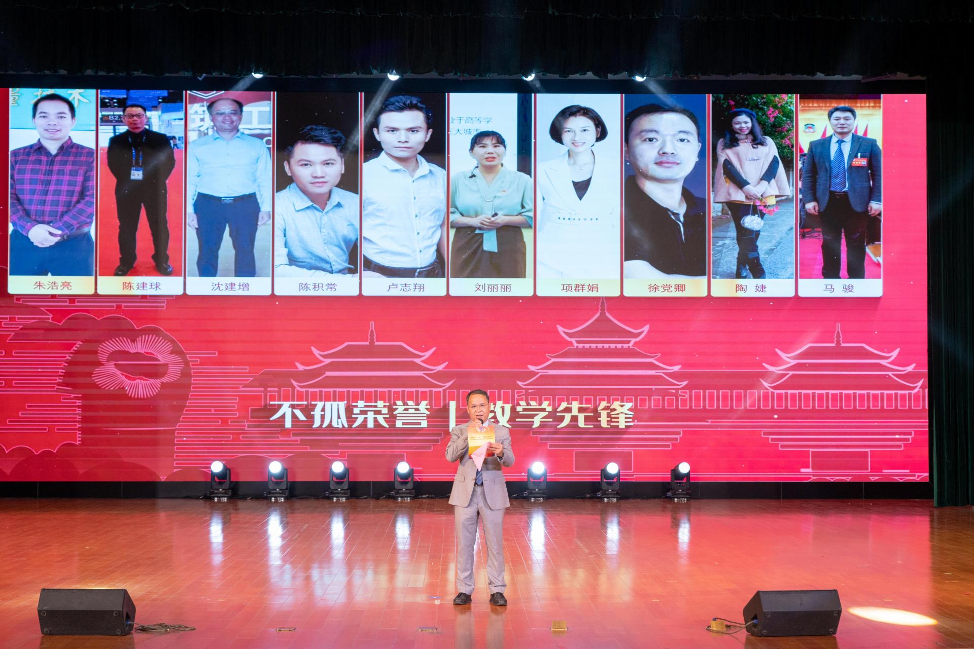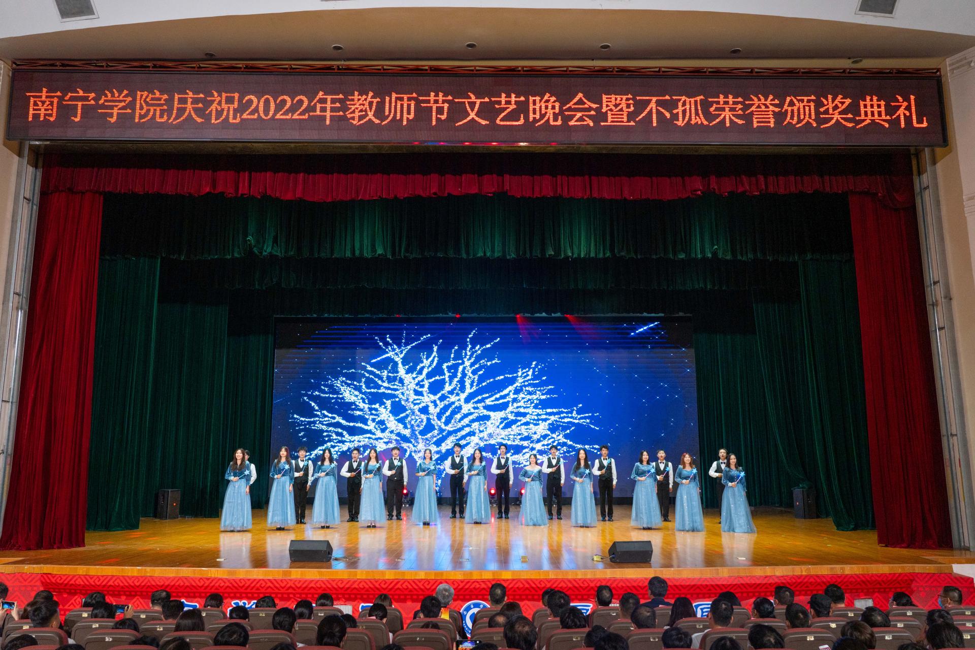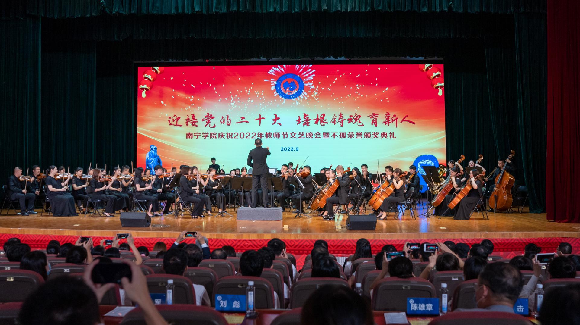 迎接党的二十大,培根铸魂育新人。在第38个教师节前夕,在党的二十大即将胜利召开之际,南宁学院在学校演艺中心举行庆祝2022年教师节文艺晚会暨不孤荣誉颁奖典礼。民革广西区委主委、自治区市场监督管理局局长、南宁学院名誉董事长巫家世,工商银行广西分行党委委员、副行长,南宁分行党委书记、行长龙云,校长李栋学,党委书记刘彪,党委副书记、纪委书记覃存民,副校长陈雄章、李陶深、龚击等领导与全体教职工和学生代表一同观看晚会,欢庆教师节并见证学校首届不孤奖的揭晓。