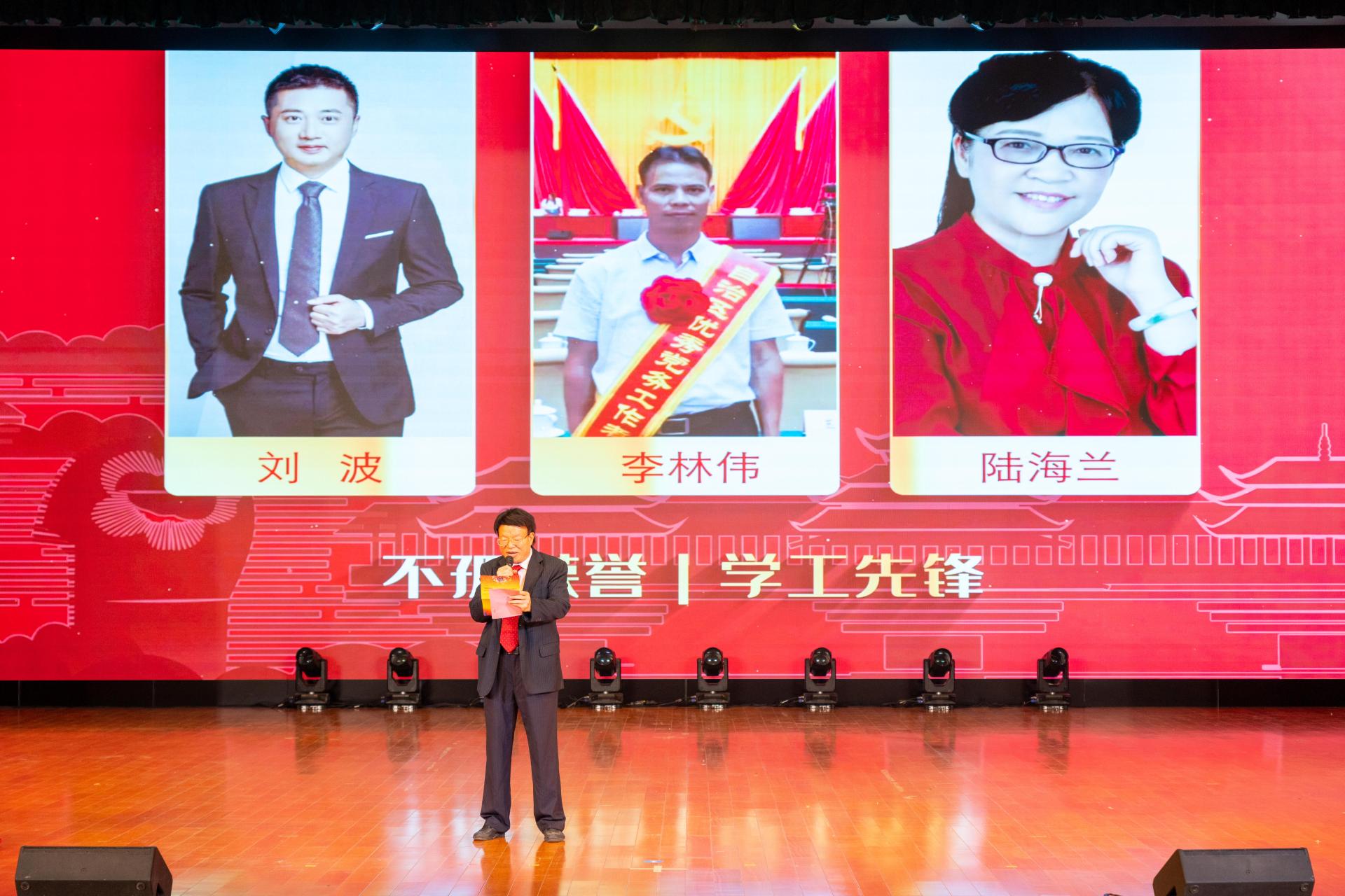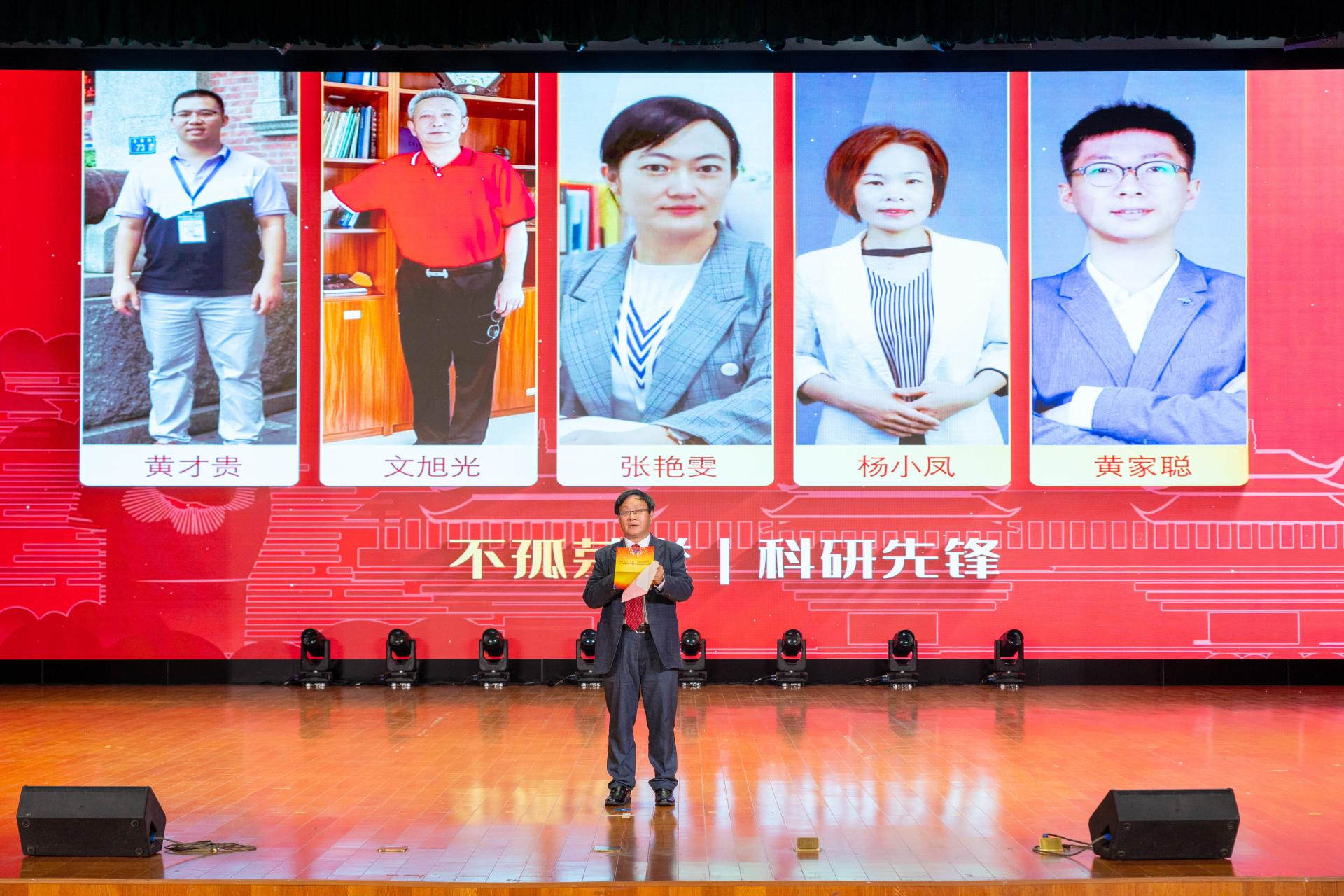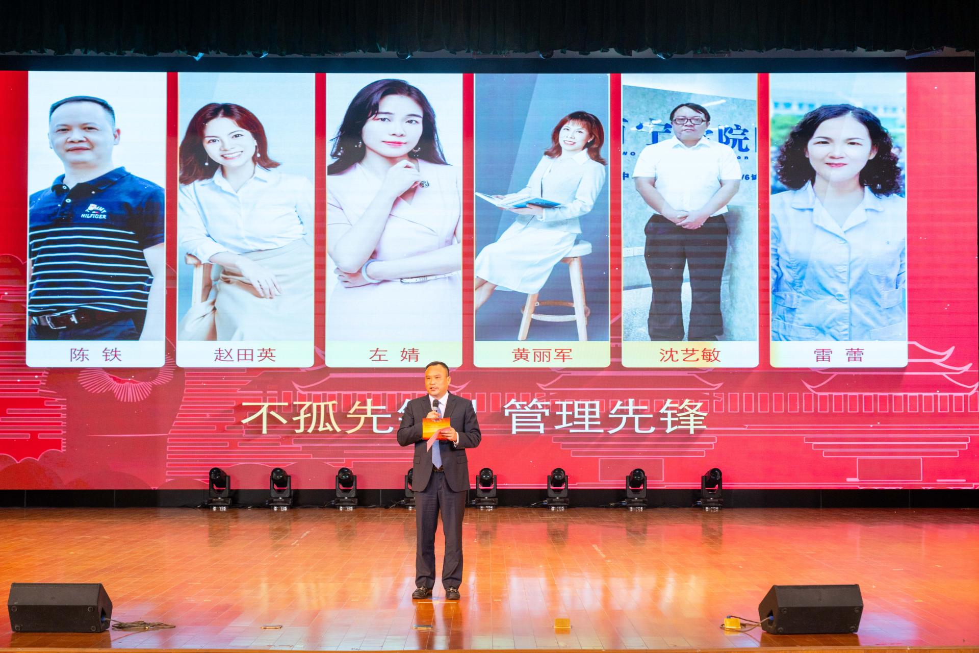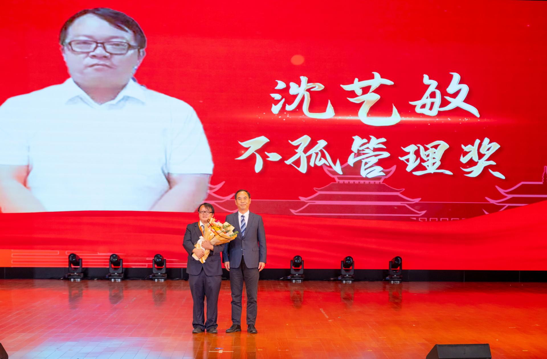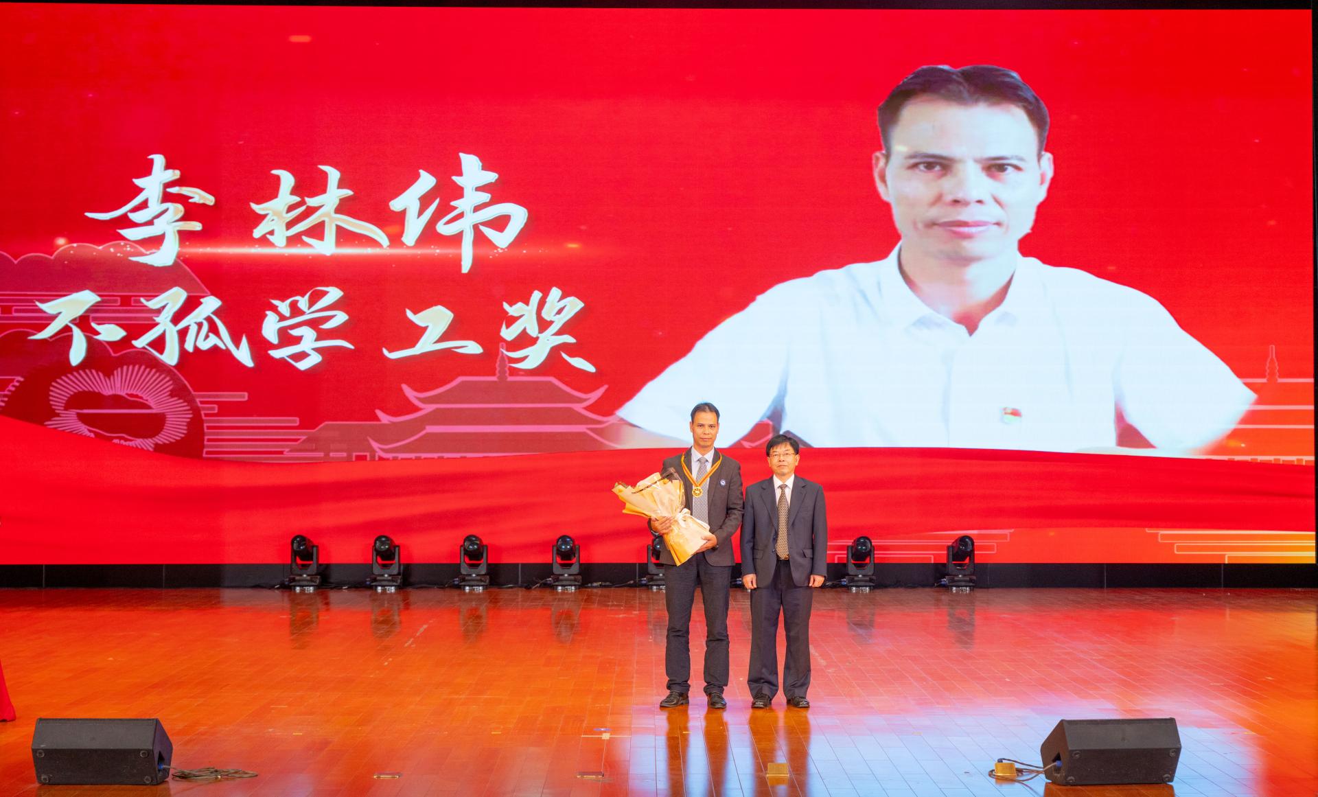 步入新发展阶段,构建新发展格局,南宁学院在推动学校高质量发展行稳致远的征程上,涌现出一批教育教学先进模范。为弘扬南院精神,表彰在学校改革和发展中做出积极贡献的同志,树立教书育人、科学研究、行政服务的榜样典范,勉励广大师生员工赋爱南院,增强广大师生员工的归属感和认同感,凝聚全校师生推动学校又好又快发展,学校于今年开展了首届不孤荣誉评选活动。按照不孤荣誉体系评选程序,经部门推荐、投票、业务部门组建评审小组评议等环节,教学、科研、学工、管理、后勤5个系列完成优秀奖、标兵奖、先锋奖的评选。典礼现场揭晓荣获各系列最高荣誉的不孤奖,创新创业学院院长马骏、广西中国-东盟综合交通国际联合重点实验室主任文旭光、资产管理处处长(原学生工作处处长)李林伟、信息化处处长沈艺敏、学校第一食堂二楼厨师长蔡柏行5人分别荣获不孤教学奖、不孤科研奖、不孤学工奖、不孤管理奖及不孤后勤奖,参加典礼的领导嘉宾分别为获奖者颁发不孤奖金牌。