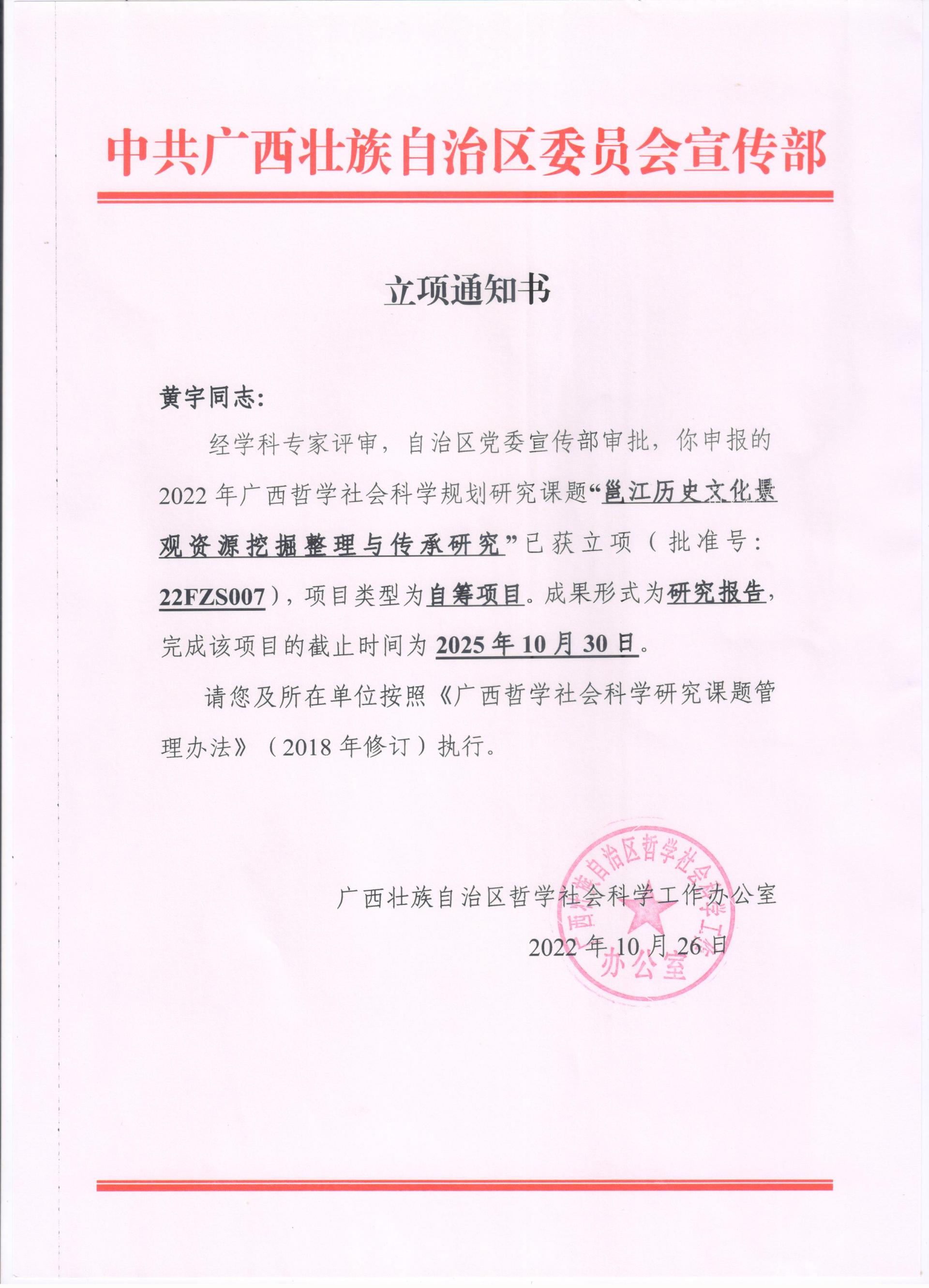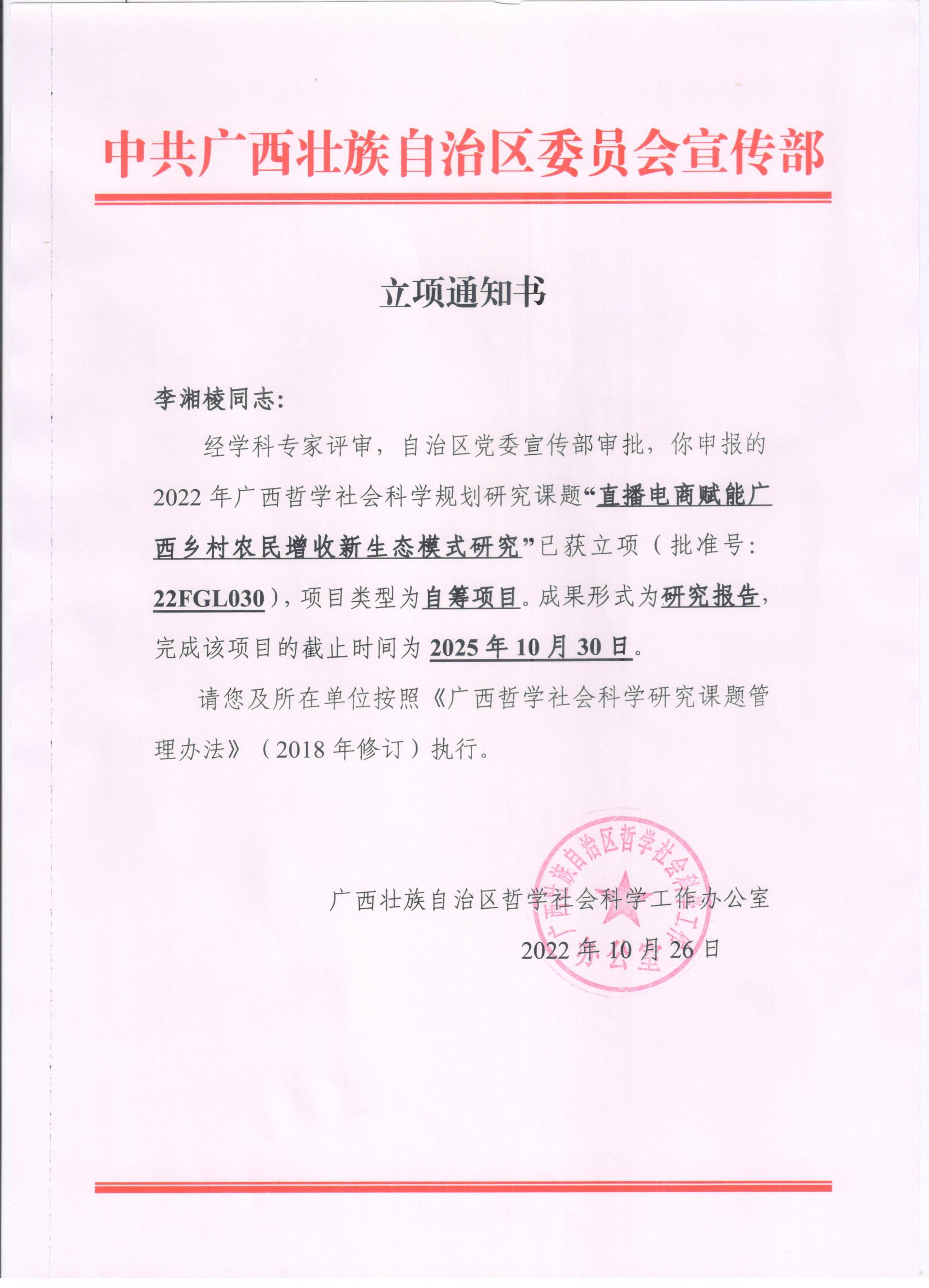 经过个人申报、单位推荐、专家评审、公示、自治区党委宣传部批准等程序,10月26日,广西哲学社会科学工作办公室下发了2022年广西哲学社会科学规划课题立项通知书。南宁学院荣获2项广西哲学社会科学规划课题立项,分别是艺术与设计学院黄宇教授主持的《邕江历史文化景观资源挖掘整理与传承研究》、数字经济学院李湘棱教授主持的《直播电商赋能广西乡村农民增收新生态模式研究》。