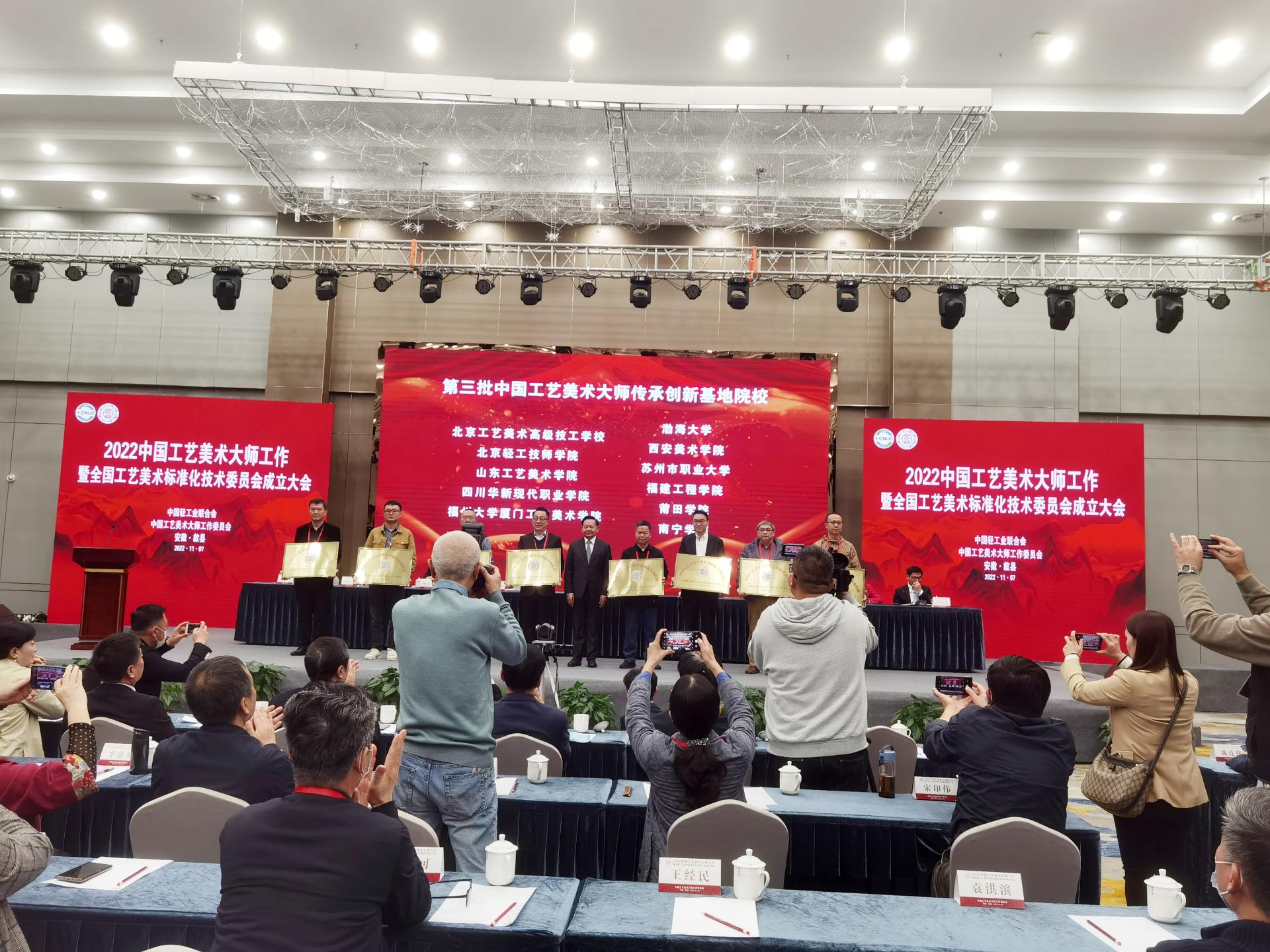 经过申报、评审、公示、中国轻工业联合会批准等程序。10月18日,中国轻工业联合会发文批准南宁学院等11所院校为第三批“中工艺美术大师传承创新基地院校”。11月8日,在安徽黄山市歙县举行2022中国工艺美术大师工作暨全国工艺美术标准化技术委员会成立大会上举行了授牌仪式,艺术与设计学院利成世教授代表学校领取牌匾。