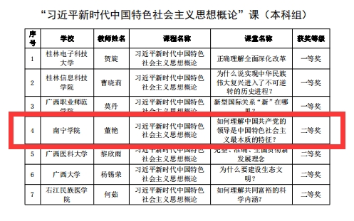 为进一步推动习近平新时代中国特色社会主义思想进教材、进课堂、进头脑,20227月至12月,自治区党委教育工委、自治区教育厅组织开展了全区高校学习习近平新时代中国特色社会主义思想示范课堂(以下简称“示范课堂”)遴选认定工作,并于2022年12月9日公布评比结果,全区共认定100堂“示范课堂”获奖。我校思想政治理论课建设三门课程的课堂获奖,董艳老师在“习近平新时代中国特色社会主义思想概论”课(本科组)荣获二等奖,郭萍萍老师在“毛泽东思想和中国特色社会主义理论体系概论”课(本科组)荣获三等奖,蓝灵燕老师在“形势与政策”课(本科组)荣获三等奖。