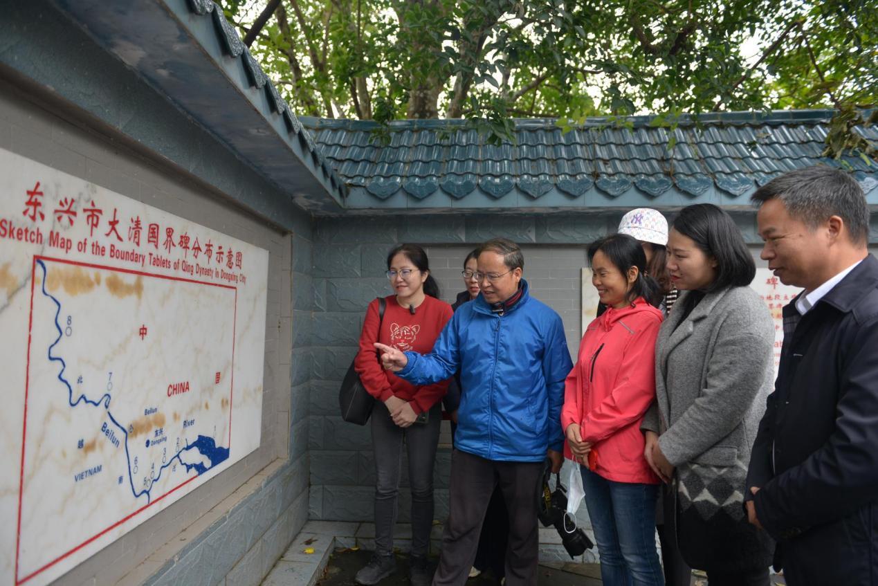 2023年1月10日—11日,南宁学院广西历史区情教育特色通识课程《铸海之魂——广西“释放海的潜力”》课程组联合校级教学团队《社会实践(传承英雄正气新体验)》赴防城港市开展了探寻“海上丝绸之路”历史足迹社会调研活动。,课程主讲教师南宁学院副校长陈雄章教授带队,教学团队负责人杨小凤教授以及课程组和教学团队成员一行8人参加了本次活动。调研组先后调研了东兴口岸、五号界碑、东兴陈公馆、大清国一号界碑、中国山海汇接地、巫头村京族哈亭、江山半岛白龙炮台、“海上胡志明小道”起点、簕山古渔村等。
