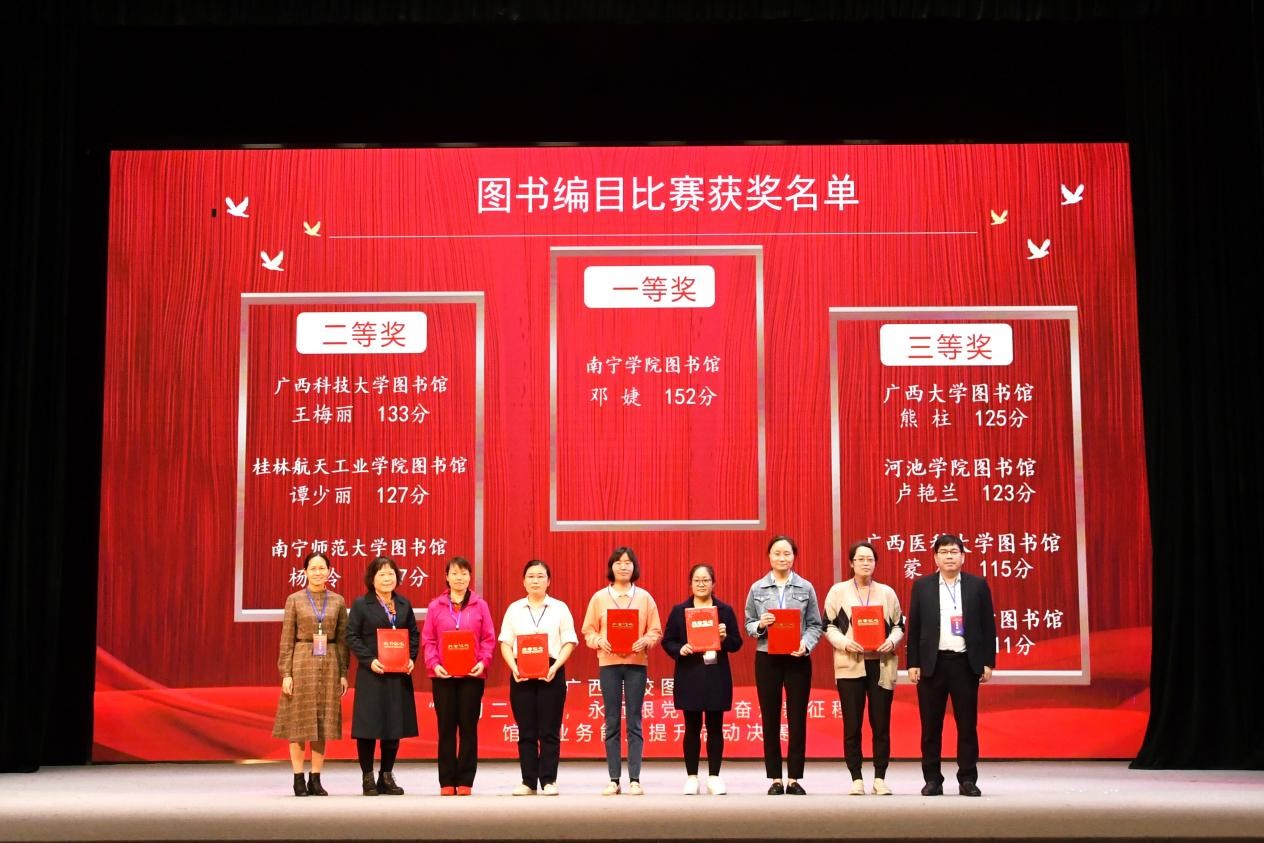 广西高校图书馆馆员业务能力提升活动由广西高教学会图书馆专业委员会、广西高校图书情报工作指导委员主办,旨在全面提升图书馆馆员业务能力,促进新环境下高校图书馆服务水平提升,比赛共吸引全区38所高校图书馆参加。经过初赛,最终广西大学图书馆、广西师范大学图书馆、广西医科大学图书馆等20所高校图书馆入围决赛,共计180名业务骨干参赛。决赛设有“图书排架”“图书编目”“信息检索”“馆员知识竞赛”等4个比赛项目,涵盖图书馆业务工作内容。在“图书编目”赛项中,我校图书馆邓婕老师荣获一等奖;在“信息检索”赛项中,陆晓老师荣获三等奖;在“知识竞赛”项目中,陆晓、邓婕、邹克梅老师组队荣获三等奖;最终以总分第6名的好成绩荣获团体二等奖。