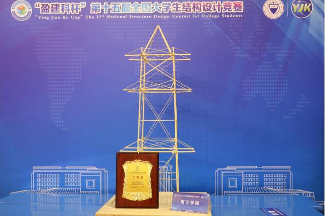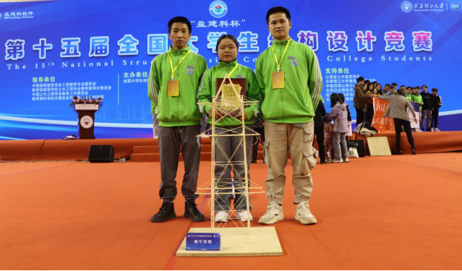 据统计,此次竞赛全国共计超过550所高校、1100支队伍参与了分区赛选拔。我校参赛选手在黄家聪老师和梁小光老师指导下,经过广西分区赛选拔,以广西唯一一所本科高校的身份参加国赛。本次大赛题目模型采用以三重木塔结构为基本单元,要求参赛者针对竖向荷载、扭转荷载及水平荷载等多种荷载工况下的空间结构进行受力分析、模型制作及加载试验。参赛选手需要在模型制作、陈述答辩、模型加载3个环节展开激烈角逐,竞争奖项。