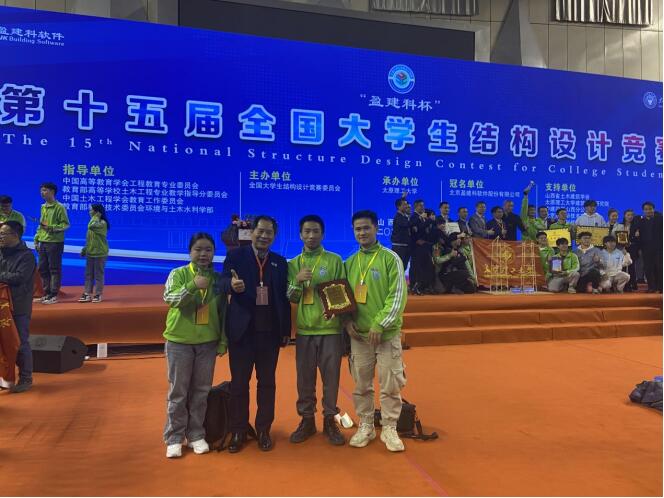 3月22日至3月26日,由全国大学生结构设计竞赛委员会主办、太原理工大学承办的“盈建科杯”第十五届全国大学生结构设计竞赛在太原理工大学成功举办。该赛事是列入2022全国普通高校大学生学科竞赛榜单里的一类赛事,包括来自清华大学、上海交通大学、浙江大学等双一流高校的110所高校的111支参赛队伍进入国赛,我校土木与建筑工程学院选派的2019级土木工程专业学生马明仕(队长)、盆斯琪、韦新林代表学校参加本次比赛。学生们经过为期3天的激烈比赛,16个小时的模型制作,克服现场工具不足、规则临时变化等不利条件,最终获得国赛二等奖。