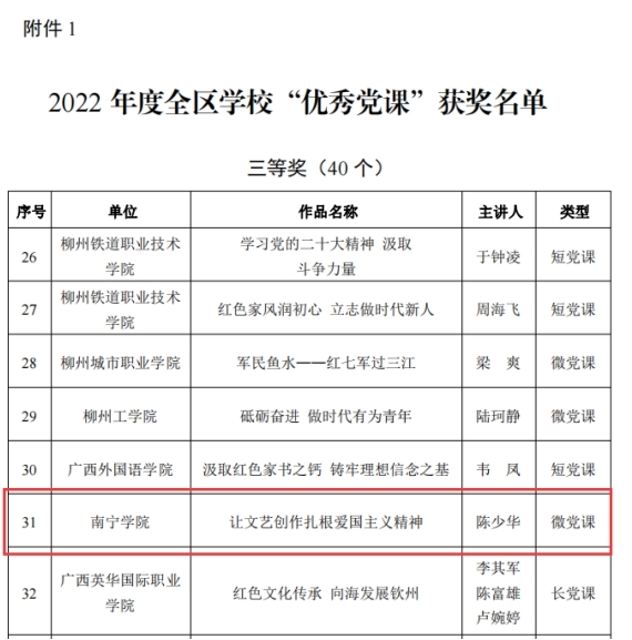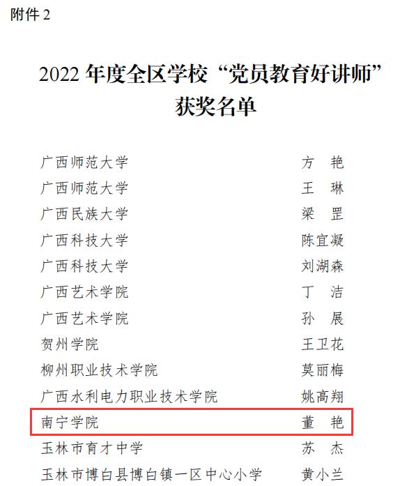 2023年4月26日,自治区党委教育工委公布2022年度全区学校“优秀党课”和“党员教育好讲师”评选结果,南宁学院马克思主义学院院长董艳老师以主讲的长党课作品《非凡十年 幸福中国》获评全区学校“党员教育好讲师”,艺术与设计学院陈少华老师以主讲的微党课作品《让文艺创作扎根爱国主义精神》获评全区学校“优秀党课”三等奖。