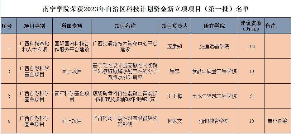 2023年5月6日,经自治区人民政府审议同意,根据《广西壮族自治区财政厅关于同意2023年自治区本级财政科技计划第二批项目安排的函》(桂财教函〔2023〕82号)《自治区科技厅关于下达2023年自治区科技计划资金新立项项目(第一批)的通知》(桂科计字〔2023〕26号),广西科技厅下达了2023年自治区科技计划资金新立项项目(第一批)1515项;其中,南宁学院交通运输学院庞彦知副教授荣获广西科技基地和人才专项立项;食品与质量工程学院程忠博士、土木与建筑工程学院王玉梅博士、通识教育学院何家文副教授荣获广西自然科学基金立项,南宁学院实现了省部级科技项目新的突破!