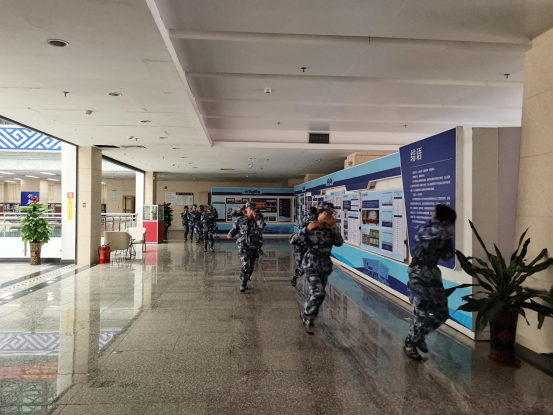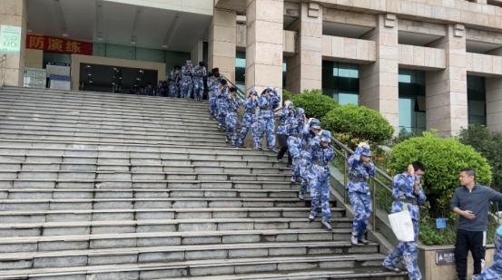 疏散演练是本次活动的第二项内容。有演练任务的学生在教官带领下到图书馆各楼层就位,各楼层阶梯转角处的安全引导员由图书馆、后勤保障与基建管理处以及部分二级学院工作人员担任。发烟机喷射烟雾,火灾报警器响起后,消防控制室广播通知学生疏散,教官带领学生迅速经楼内消防通道疏散到室外广场,整个过程紧张有序。