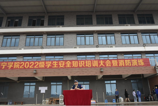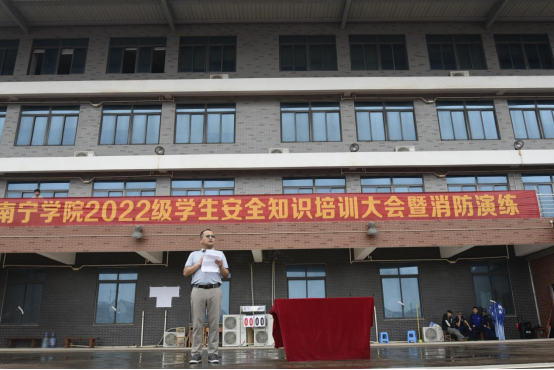 为增强学生对消防风险的防范意识,提高学生面对灾情的处理能力,保障学生的生命安全,2023年5月14日上午,我校举行了2022级学生消防安全知识培训暨疏散演练活动。学校邀请了南宁市邕宁区龙岗消防救援站李东良副站长及相关消防战士为2022级学生进行消防安全知识培训与疏散演练,学生工作处、后勤保障与基建管理处主要负责同志,各学院、部门相关工作人员参与了本次活动。