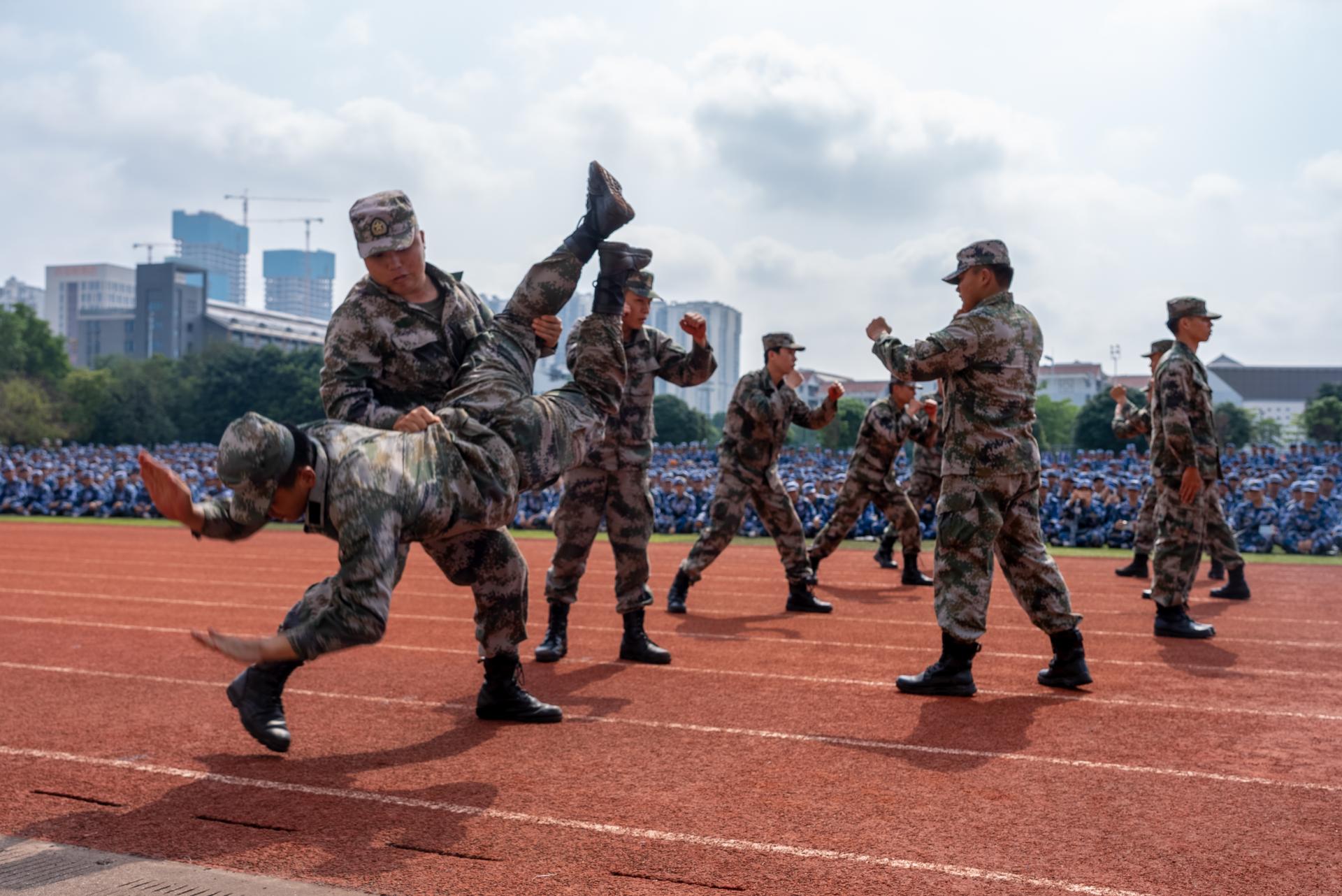 军训总结表彰大会在庄严的升旗仪式和雄壮的国歌声中拉开帷幕。校领导集体检阅了军训队伍,同学们用崭新的面貌、昂扬的精神、挺拔的军姿和洪亮的口号接受了学校领导的检阅。检阅后进行军训会操表演,包括分列式和主题表演。同学们步伐整齐、口号洪亮、军姿严整、士气高昂,全面展示了本次军训的成果,充分体现了南院学子朝气蓬勃、昂扬向上的精神风貌,让我们感受到同学们发出的“请党放心,强国有我”的时代最强音。