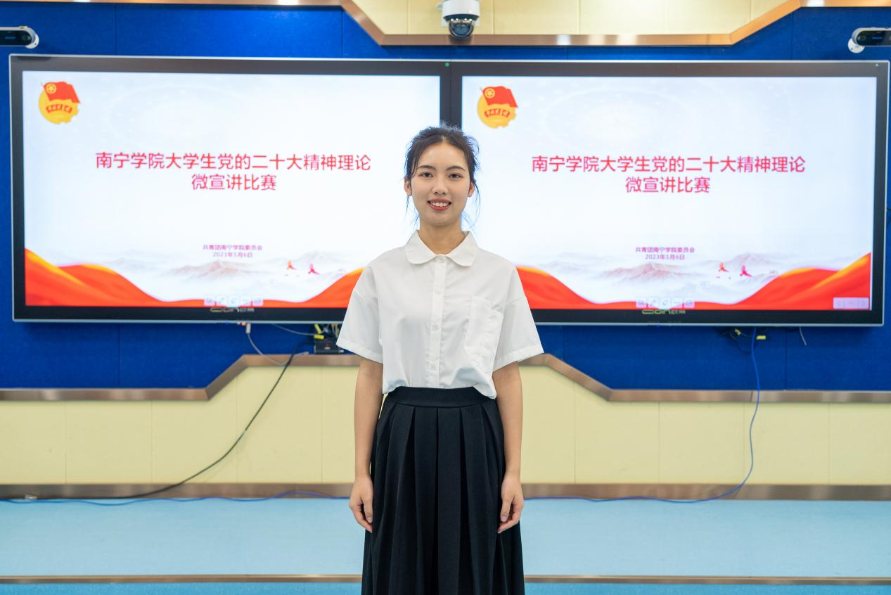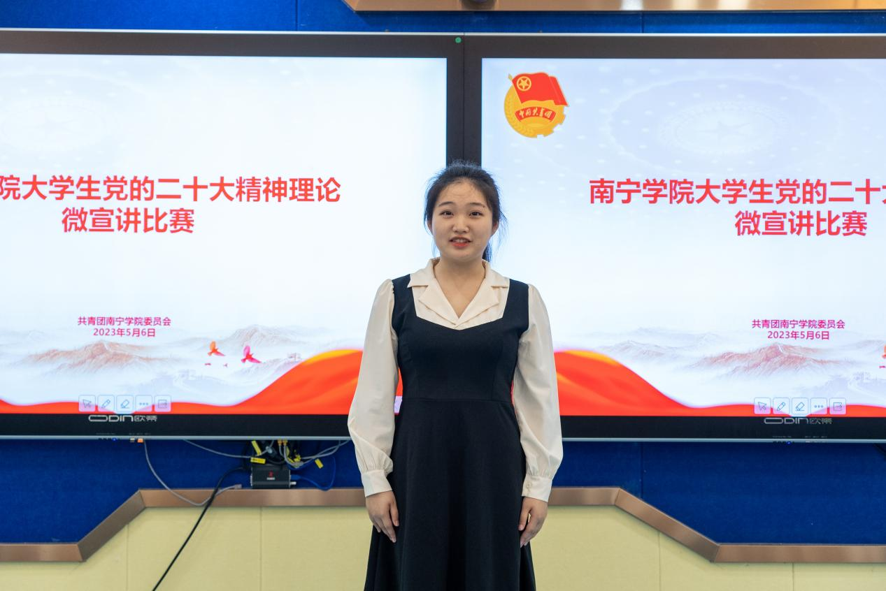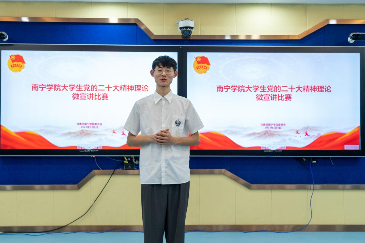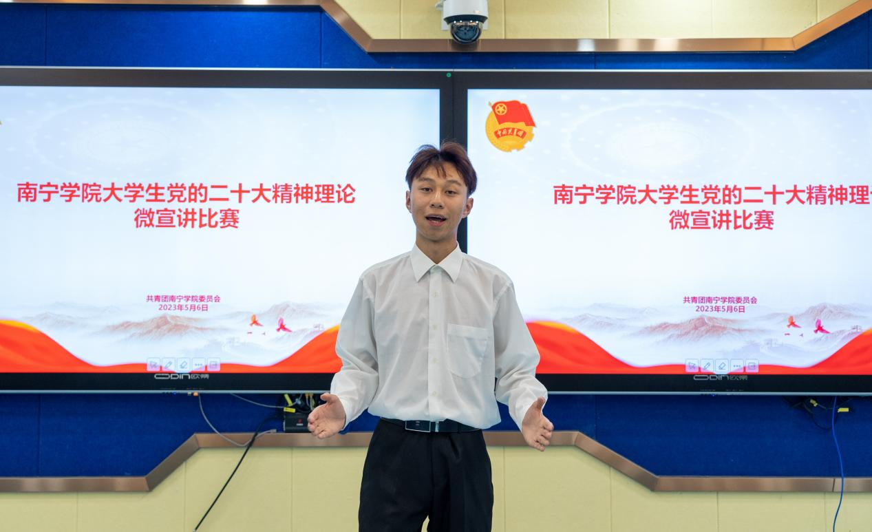 根据《自治区党委教育工委办公室自治区教育厅办公室关于开展广西高校大学生党的二十大精神理论微宣讲比赛的通知》(桂教工委办〔2023〕59号)文件内容,为引导全区高校大学生学思践悟党的二十大精神,深刻领悟“两个确立”的决定性意义,增强“四个意识”,坚定“四个自信”,坚决做到“两个维护”,推动党的创新理论走进青年、深入人心,南宁学院开展大学生党的二十大精神理论微宣讲比赛。