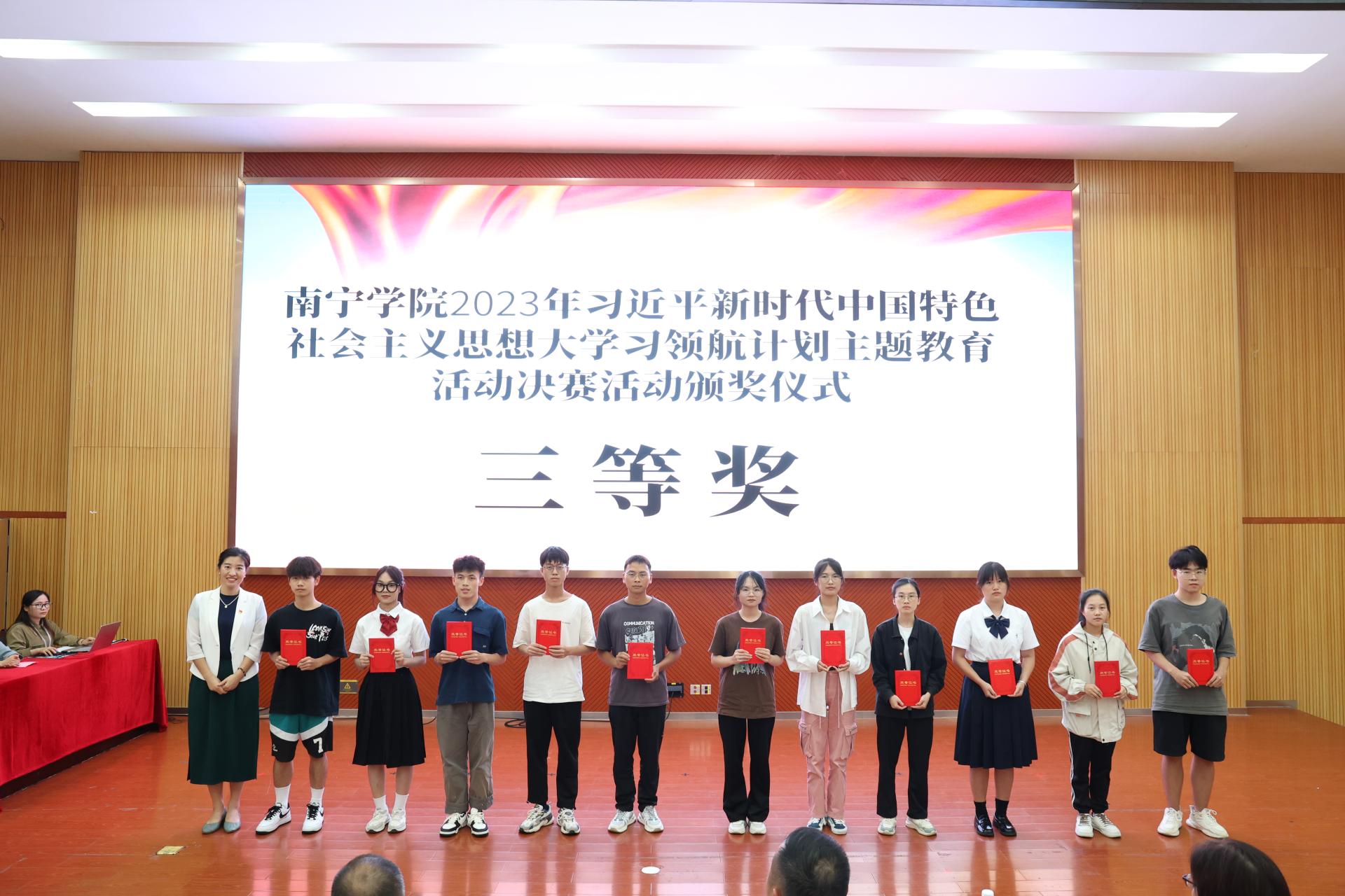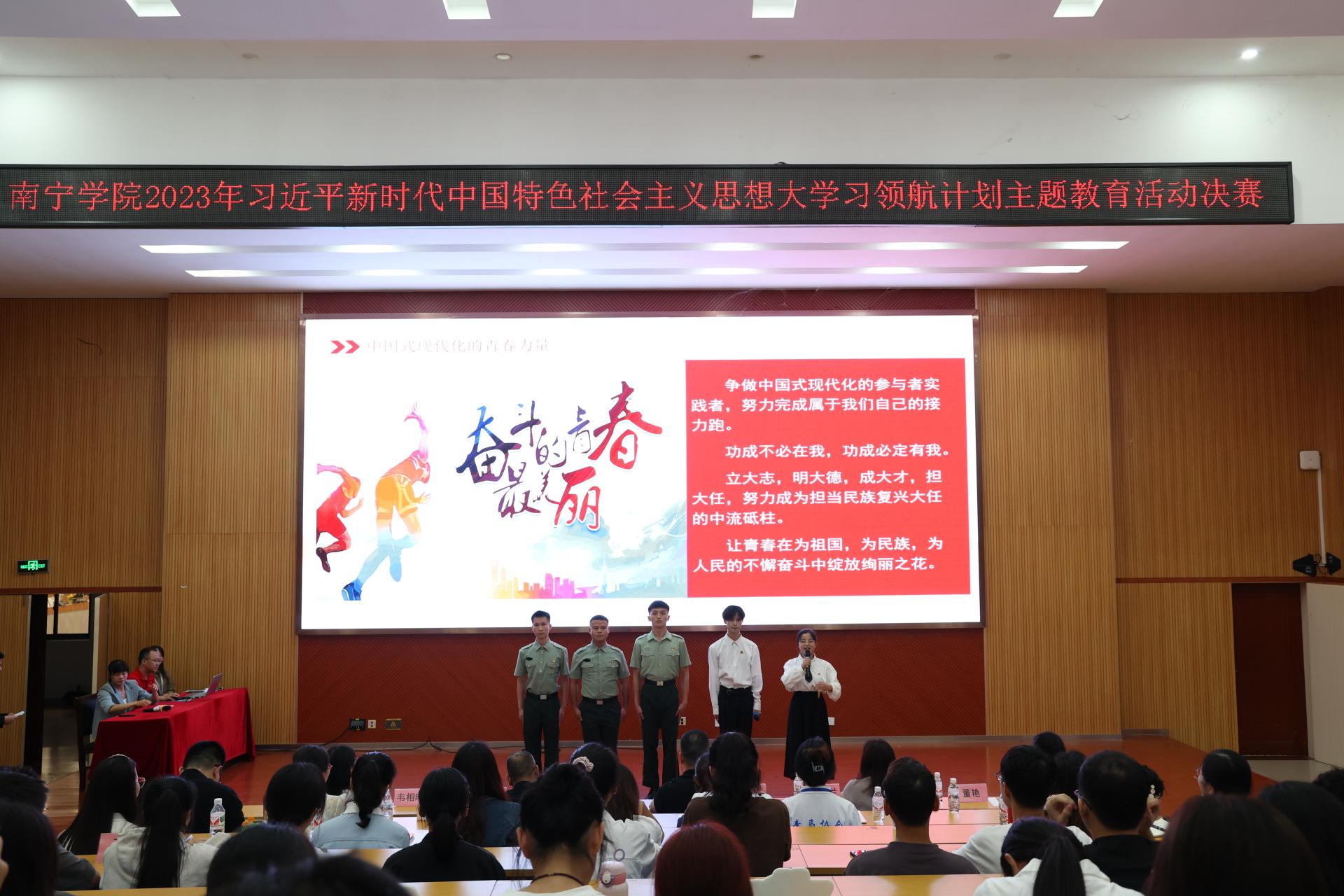为坚持不懈用习近平新时代中国特色社会主义思想铸魂育人,充分发挥“大思政课”实践教学育人作用,用新时代十年伟大变革的生动实践把道理讲深、讲透、讲活,不断提高思政课的针对性和吸引力,引导学生深刻领悟“两个确立”的决定性意义,增强“四个意识”、坚定“四个自信”、做到“两个维护”,坚定不移听党话、跟党走,2023年3月,学校启动南宁学院2023年习近平新时代中国特色社会主义思想大学习领航计划主题教育活动。历时三个月的运作,6月25日,“领航计划”主题教育活动总决赛在大学生活动中心103举行。