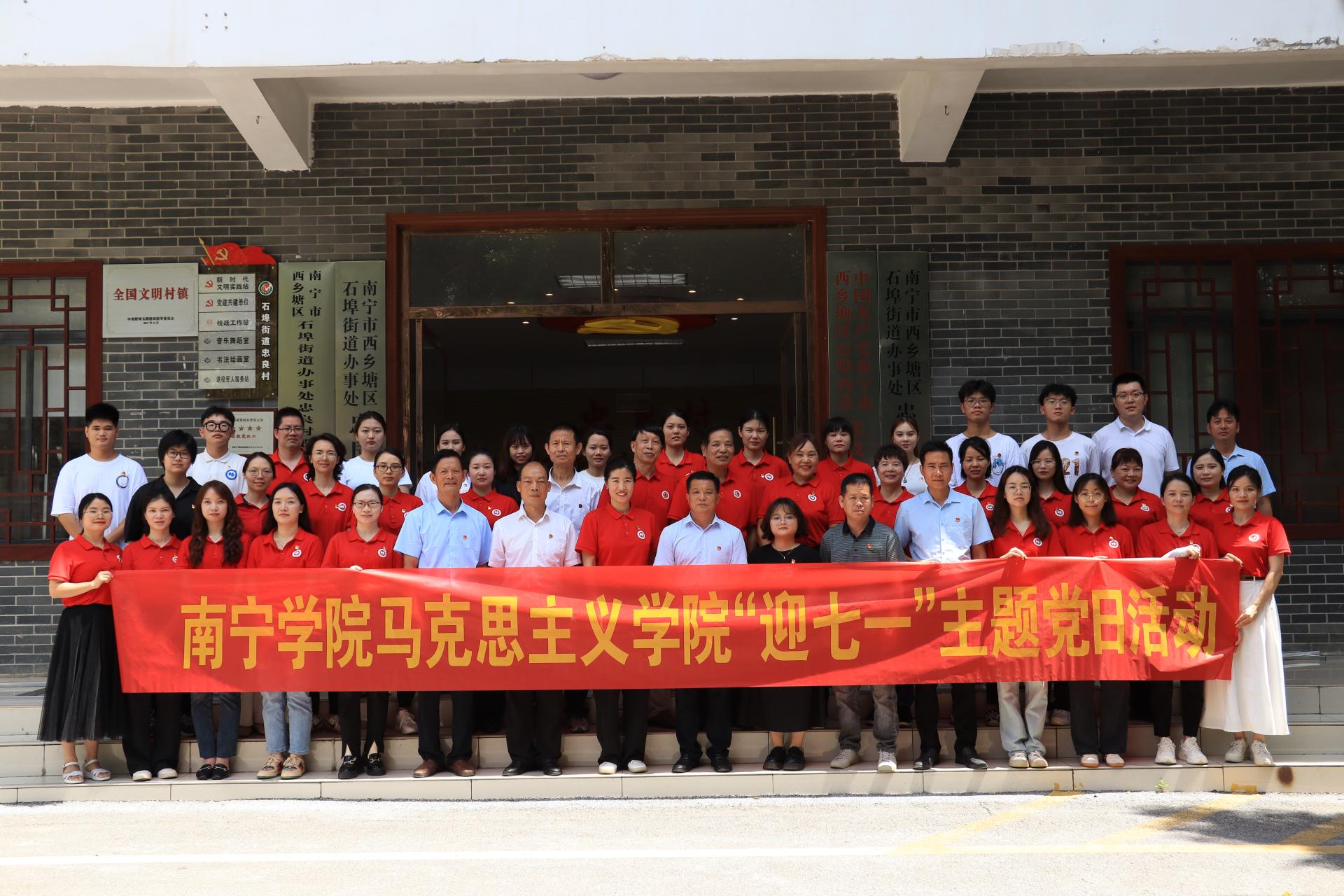为深入学习贯彻落实党的二十大精神,贯彻习近平总书记关于“大思政课”建设的重要指示精神,贯彻落实习近平总书记对广西“五个更大”重要要求、视察广西“4.27”重要讲话和对广西工作系列重要指示精神,紧抓新时代壮美广西建设契机,加强校地合作融合,不断优化思政育人的“理论+实践”创新模式,推动新时代的思想政治教育工作再上新台阶。马克思主义学院与南宁市西乡塘区石埠街道忠良村合作共建南宁学院“大思政课”实践教学基地。7月1日上午,马克思主义学院党支部组织全体党员教师赴忠良村举行“大思政课”实践教学基地揭牌仪式暨“七一”主题党日活动。