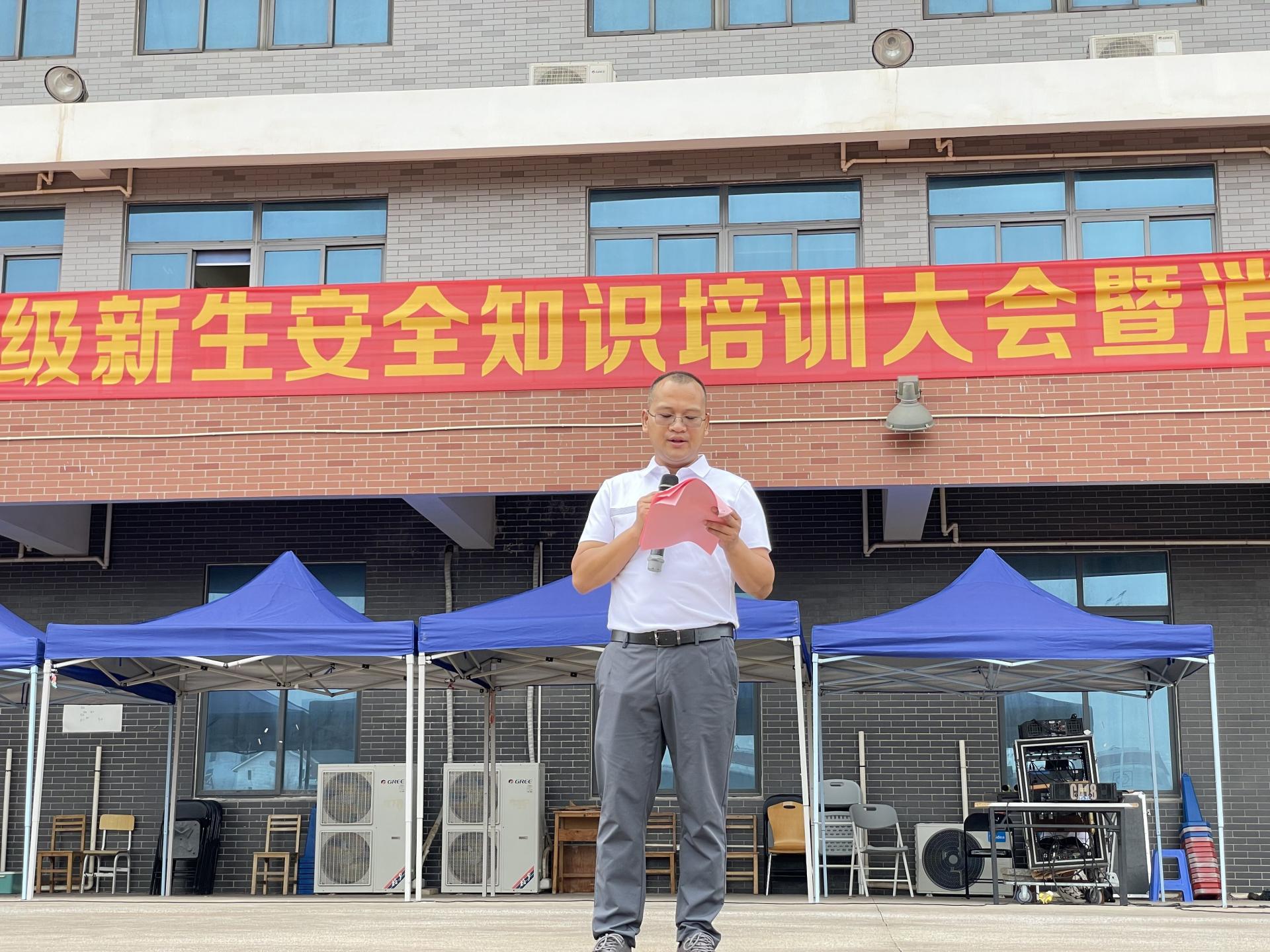 活动的第一项内容是安全知识培训。2023级学生们在军训教官地指挥下列出整齐方队,在学校田径场参加培训。后勤保障与基建管理处处长邓斌同志发表动员讲话,他通报了近期以来全国较为重大的火灾事故和南宁市今年以来发生的火灾事故,总结火灾事故的惨痛教训,警示同学们一定要提高认识、端正态度,全身心投入演练场景之中,在观摩中、在实践中有所感悟、有所收获。他希望通过这次活动,进一步加强学校消防安全“四个能力”建设,全面普及消防安全知识,提升群防群治水平,增强同学们的消防安全意识,提升火灾应急疏散和逃生自救技能。