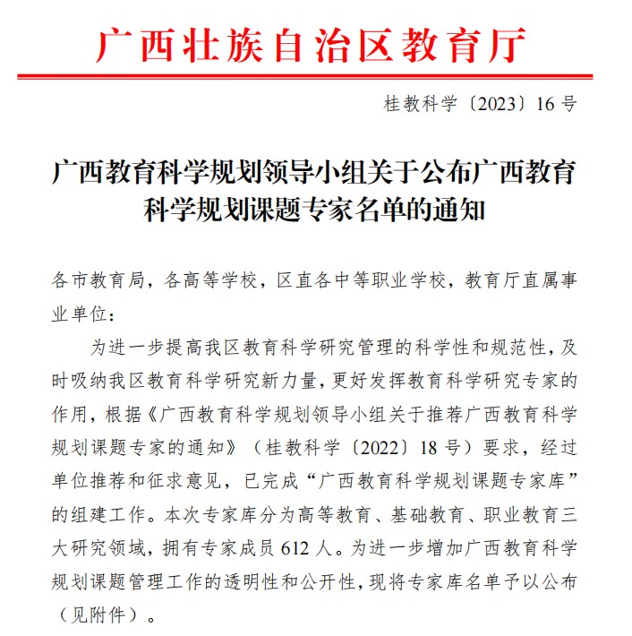 广西教育厅公布广西教育科学规划课题专家名单的通知