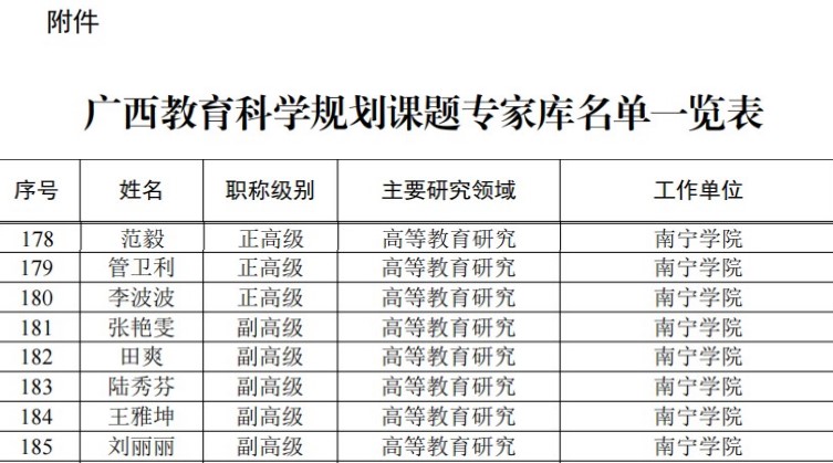 近日,根据广西教育厅发布的《广西教育科学规划领导小组关于公布广西教育科学规划课题专家名单的通知》文件获悉,我校张艳雯、管卫利、范毅、李波波、田爽、陆秀芬、王雅坤、刘丽丽8位教师成功入选广西教育科学规划课题专家库。