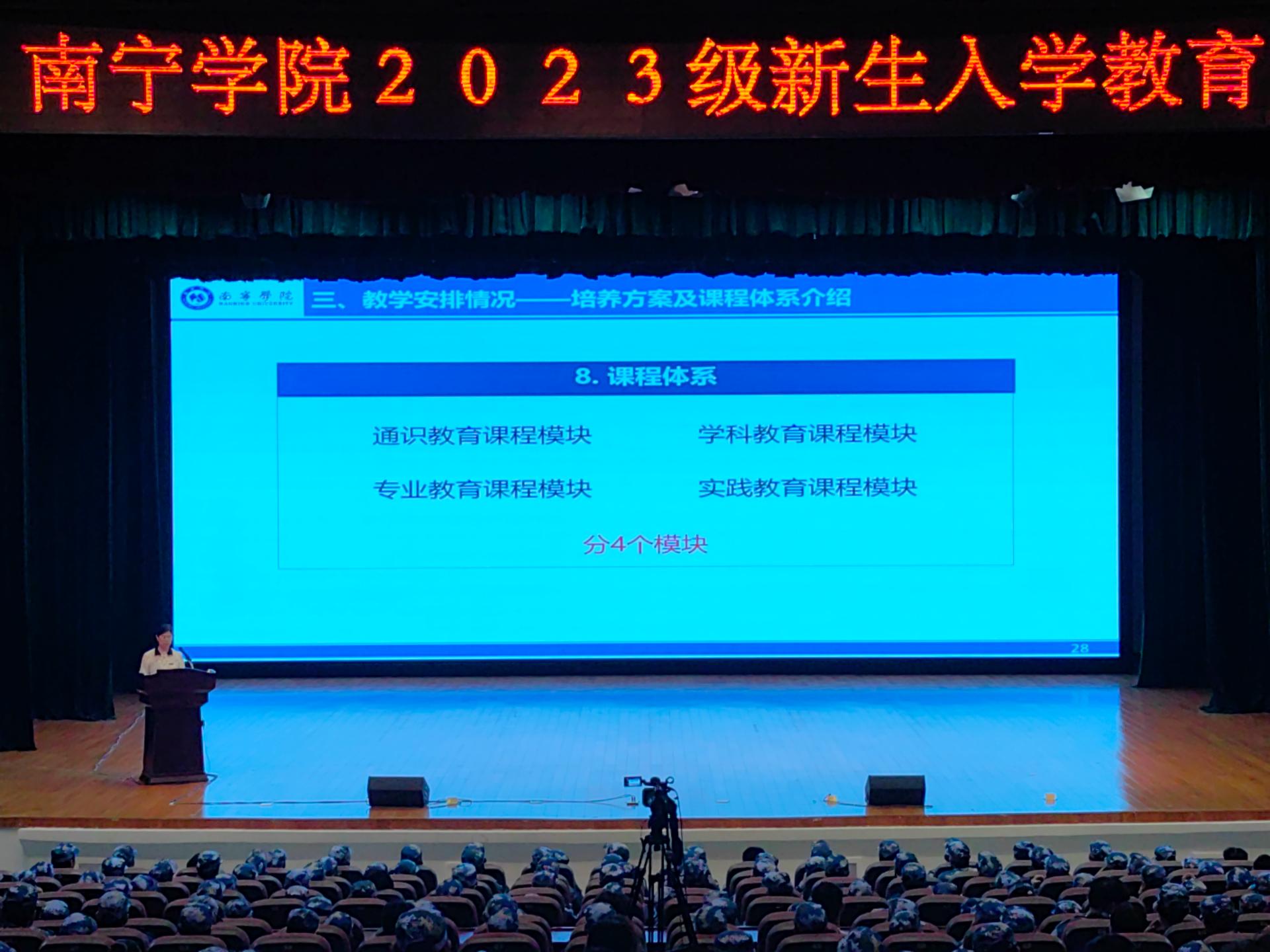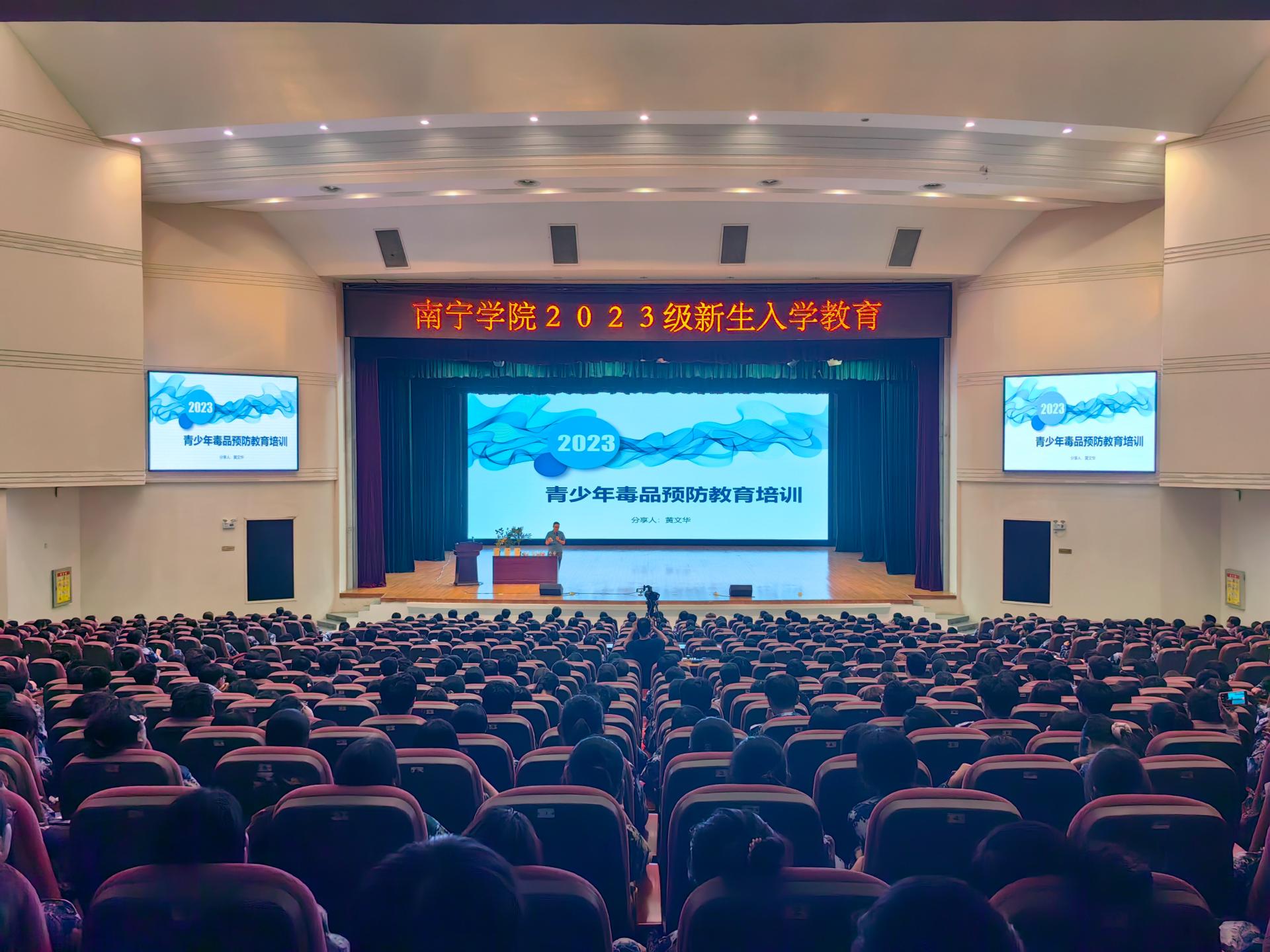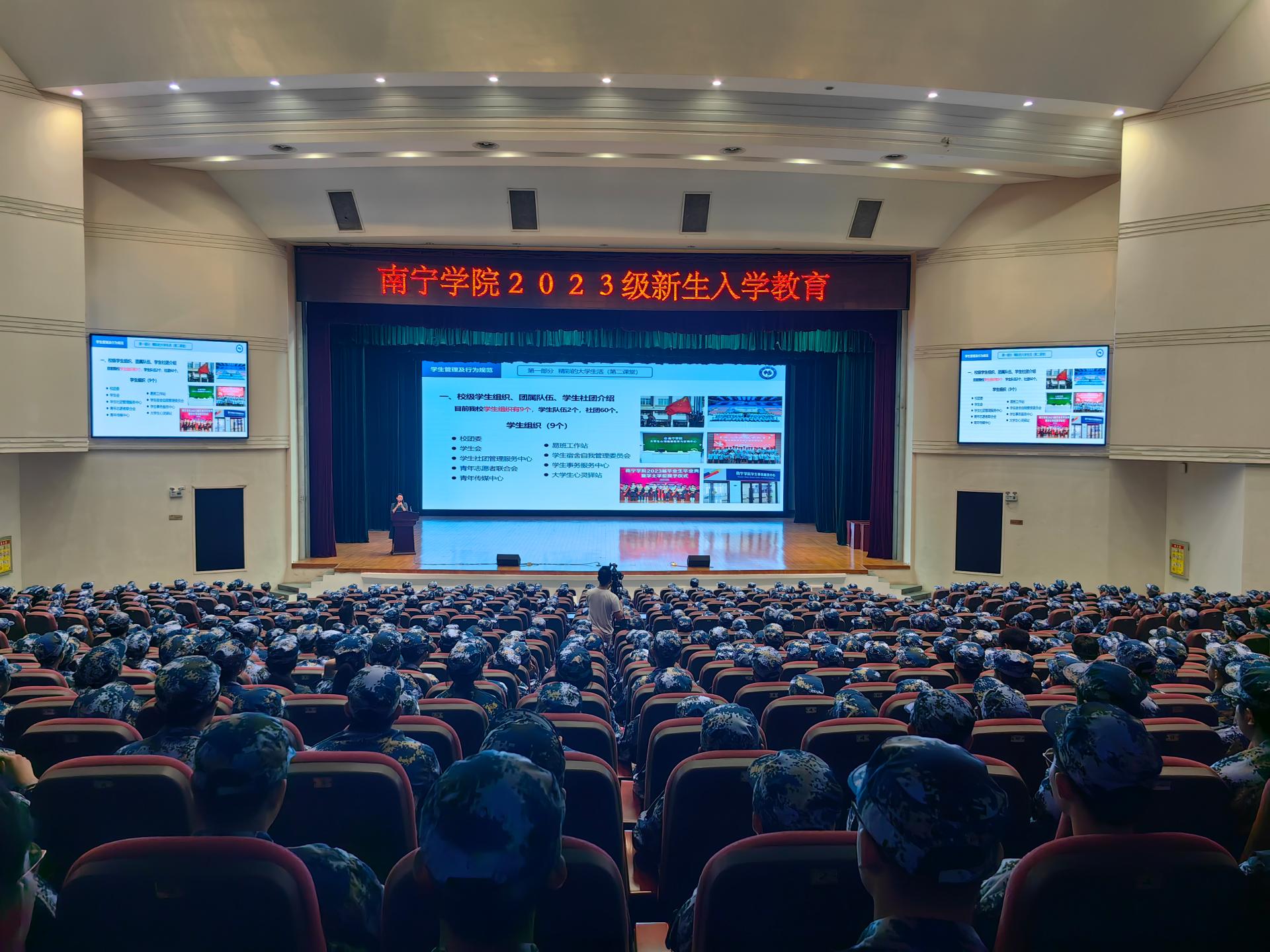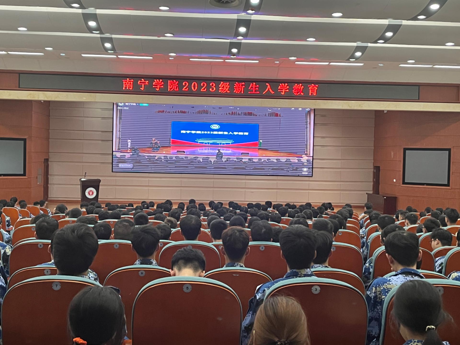 金秋送爽,丹桂飘香,南宁学院2023级新生怀揣着梦想开始了全新的校园生活。为切实做好2023级新生入学教育工作,加强新生思想政治教育,帮助新生学会科学规划学习和生活,提高心理健康素质,增强安全防护意识,顺利完成角色转变,系好大学的第一粒扣子。我校于9月11日-9月19日期间,开展2023级新生入学教育,讲座形式通过在演艺中心开展线下现场培训。同时,在图书馆报告厅、活动中心103、敷文园E104和体育馆等场所开展现场观看线上直播