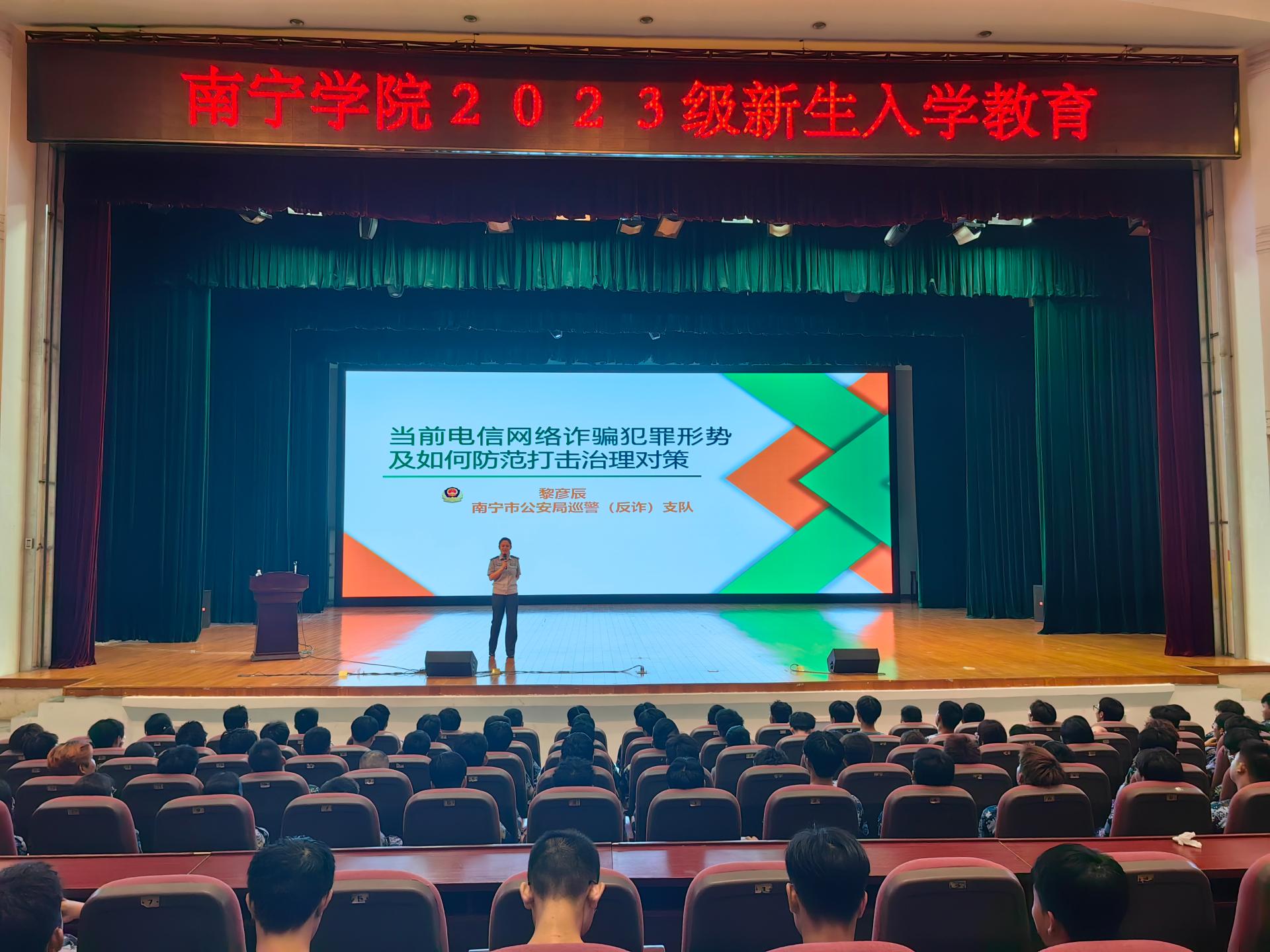 南宁市公安局巡警(反诈)支队黎彦辰以当前电信网络诈骗犯罪形势及如何防范打击治理对策为题给新生授课