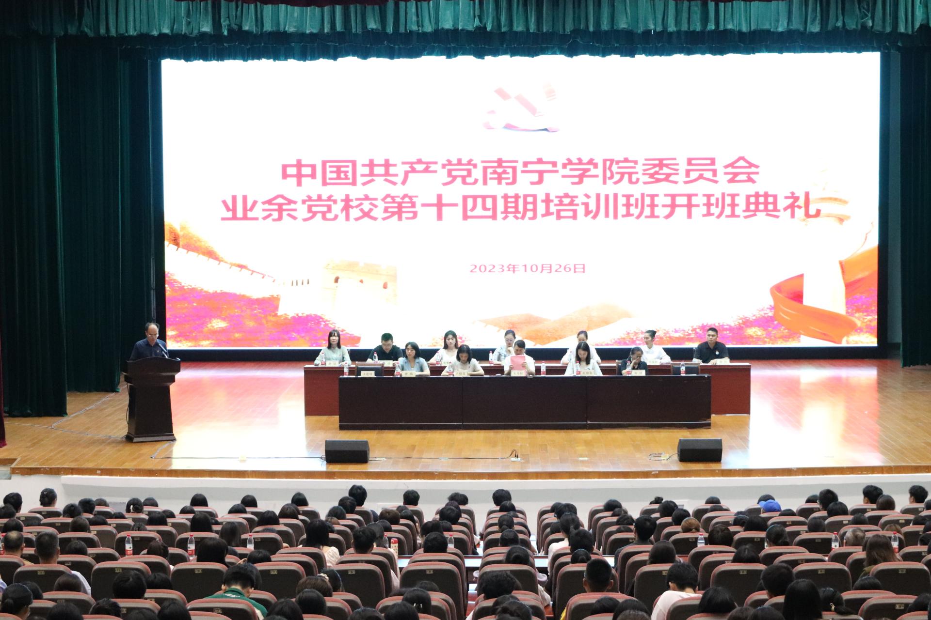 不负青春,勇担重任。为端正新时代青年的政治思想觉悟和综合素质,进一步加强对递交入党申请书、积极向党组织靠拢的师生进行培养和教育,2023年10月26日晚,中国共产党南宁学院委员会业余党校第十四期培训班开班典礼在演艺中心举行。参加本次典礼的有校党委副书记韦粤桂、校党委组织部部长赵田英及副部长唐梅、各二级学院党委(党总支)书记(副书记)、专职组织员、学生党支部书记和培训班全体学员。开班典礼由土木与建筑工程学院党委书记沈建增主持。