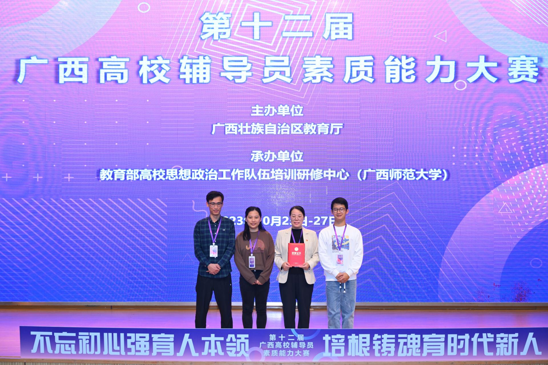 2023年10月25日至27日,由广西壮族自治区教育厅主办的第十二届广西高校辅导员素质能力大赛在广西师范大学举行,我校艺术与设计学院辅导员郭莉老师荣获大赛二等奖。
